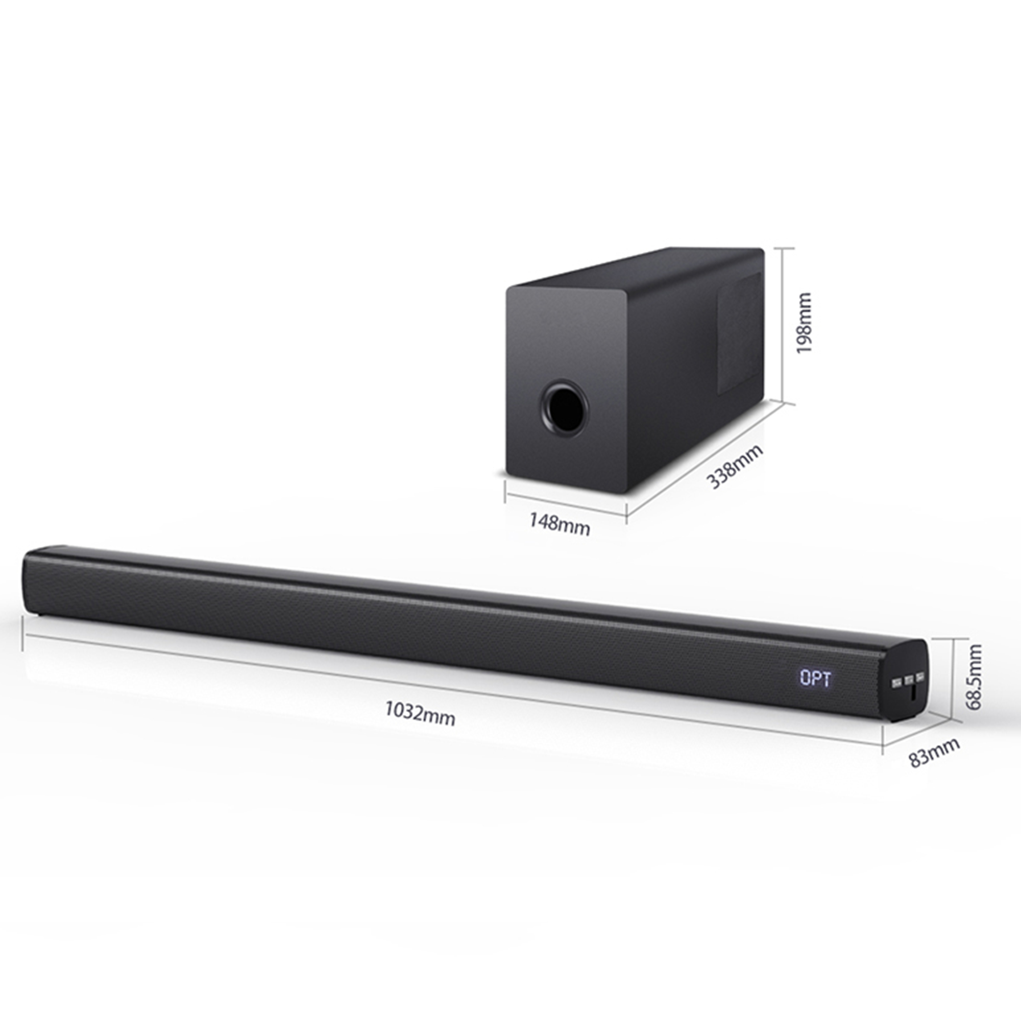 6. Dimension: 1032*83*68.5mm. Subwoofer Dimension: 150x200x335(D)mm