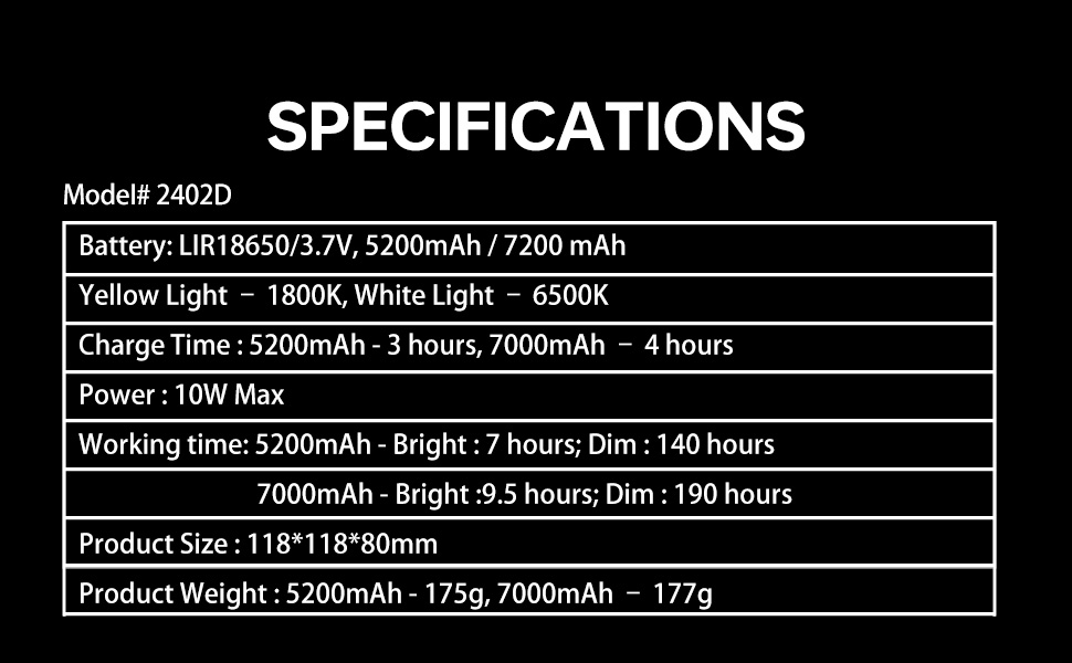 - Boasts an impressive battery life of up to 7 hours on high brightness mode and an extended 140 hours on low brightness mode, powered by a 5200mAh battery. This ensures reliable lighting even during extended use or emergencies.