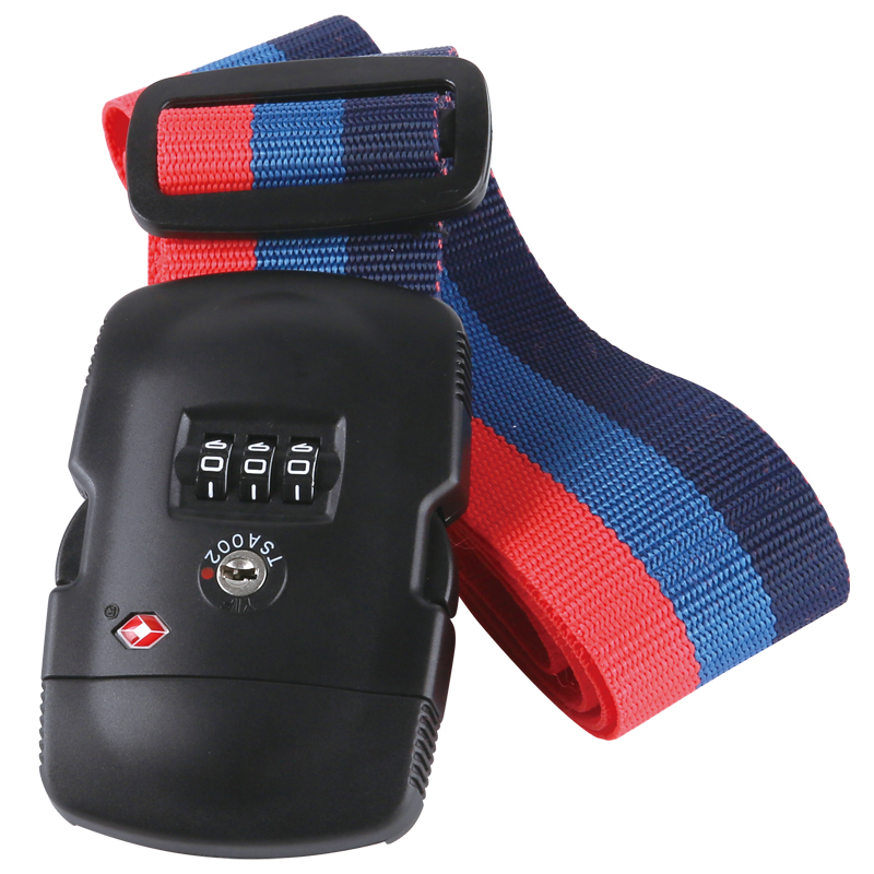 Pictured here is a TSA approved luggage strap with a 3-dial combination lock buckle. This adjustable strap is designed to fit all suitcases and can be used to keep it shut. Coming in a bright color, this luggage strap makes finding your luggage in crowded baggage areas a lot easier.