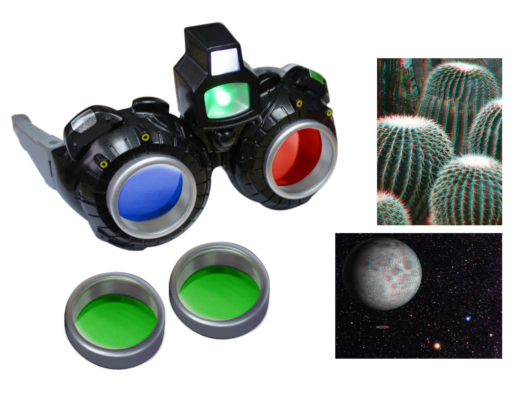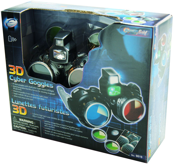 Presented here is a pair of goggles with interchangeable red and blue lenses for viewing realistic 3D anaglyph photos and videos. The goggles also come with green lenses for night vision. This pair of 3D goggles features a very cool design.