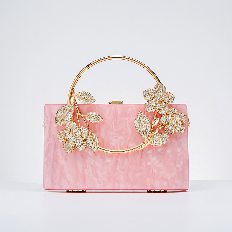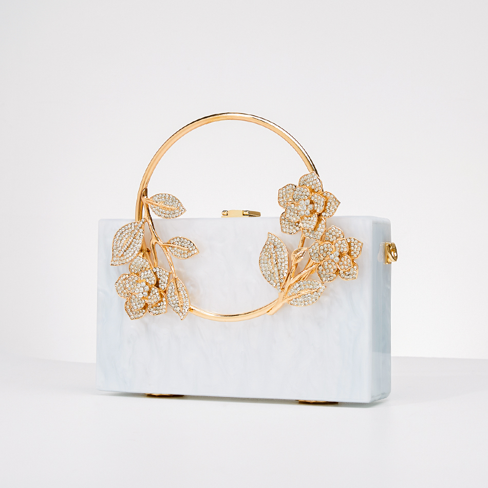 Make a magnificent statement with the ultra-luxurious 'Aurora' hard-case box clutch, the definitive accessory for a formal or bridal event. Crafted from high-gloss marbled resin or acrylic, available in both delicate white-and-grey swirl and soft blush pink, the bag’s structured silhouette provides a modern canvas for its breathtaking detail. The focal point is a large, ornate gold-toned circular handle that is lavishly embellished with an intricate spray of rhinestone-encrusted flowers and foliage. This clutch is pure artistry and glamour, guaranteed to turn heads.