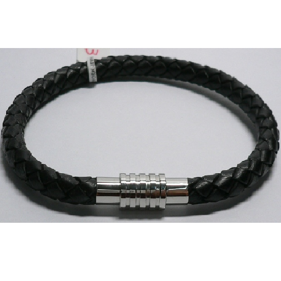 Stainless Steel Bracelet, magnetic clasp with black bolo leather cord