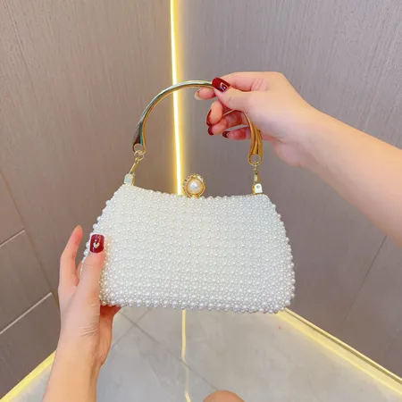 Step into timeless elegance with this exquisite 'Bianca' pearl-embellished mini handbag, the ultimate accessory for formal events, weddings, and sophisticated evenings. Each piece is meticulously covered in luminous imitation pearls, creating a luxurious, textured surface that captures light beautifully. The structured, classic silhouette is perfectly complemented by a sleek gold-tone arched top handle and a central pearl-adorned clasp, blending vintage charm with modern glamour.