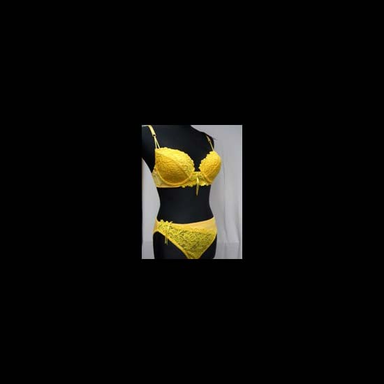 Emphasize your curves with this set of bra and brief. The demi bra comes with a sturdy underwire structure to give you a full support and lift. Both the bra and the brief have elegant lace patterns on them to give a classy appearance. The center of the bra and the side of the brief are embellished with ribbons to add a touch of femininity. Crafted in a vivid yellow color, this delicate bra set will brighten up your day and give you a stylish feeling.