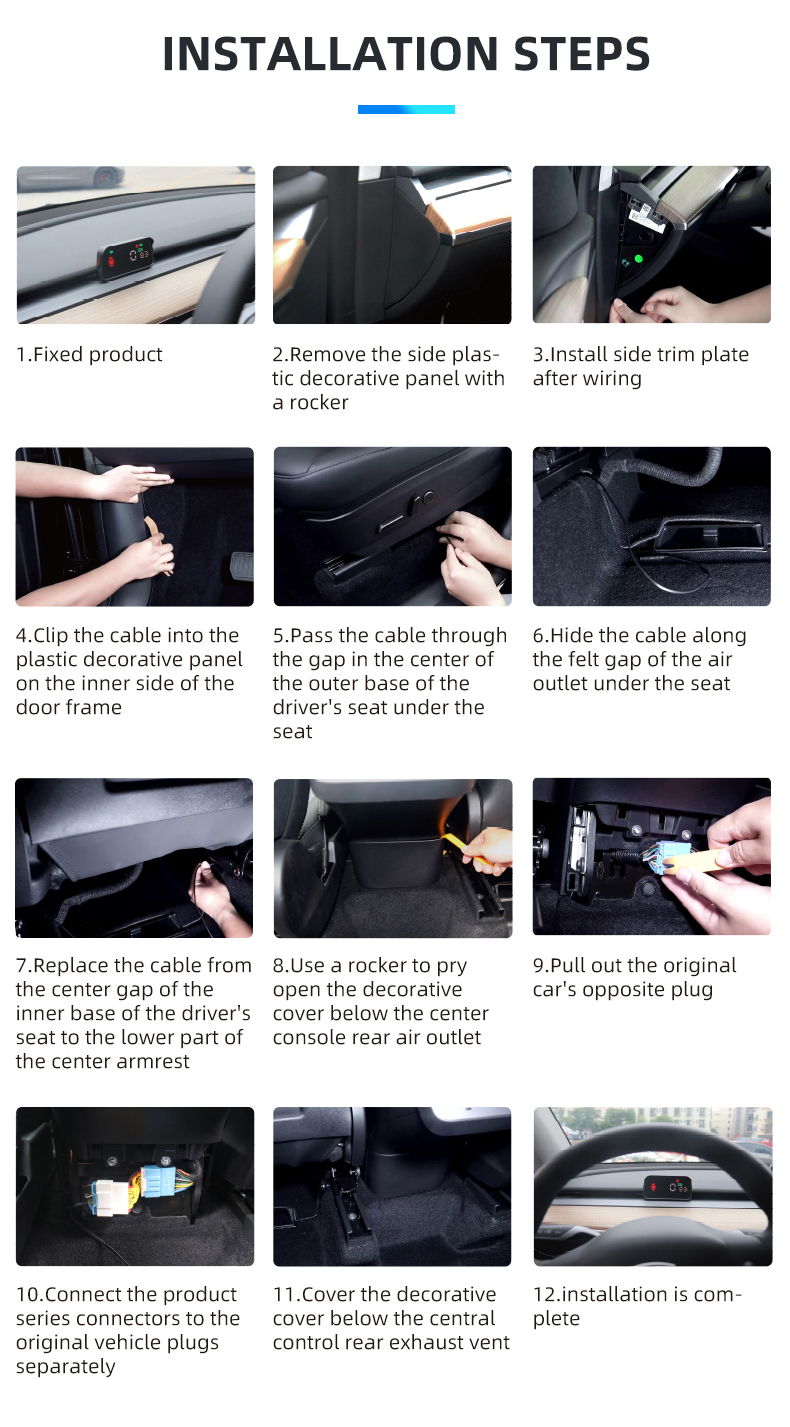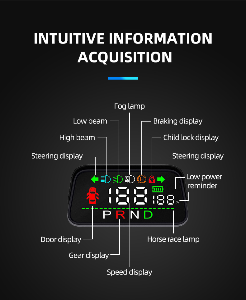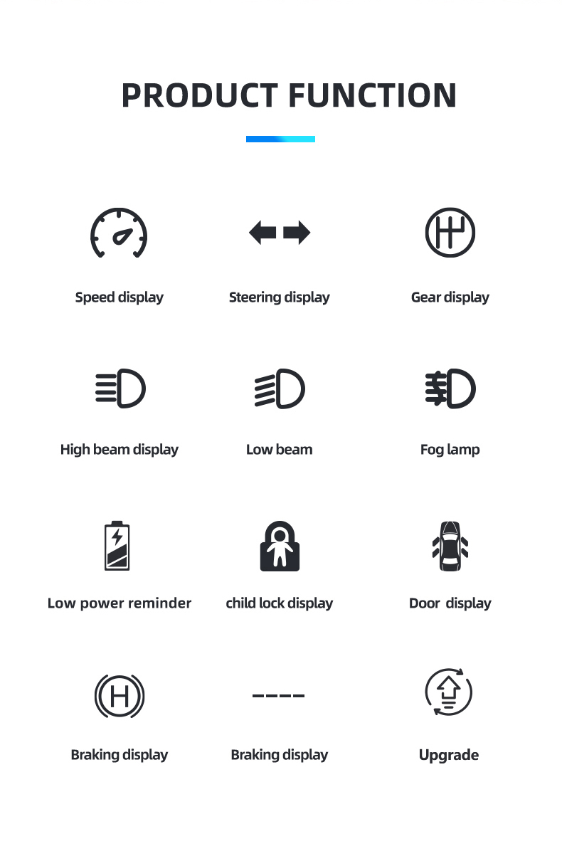 Speed display,Steering display,Gear display, High beam display,Low beam,Fog lamp,Low power reminder,Child lock display, Door display,Braking display,Upgrade.