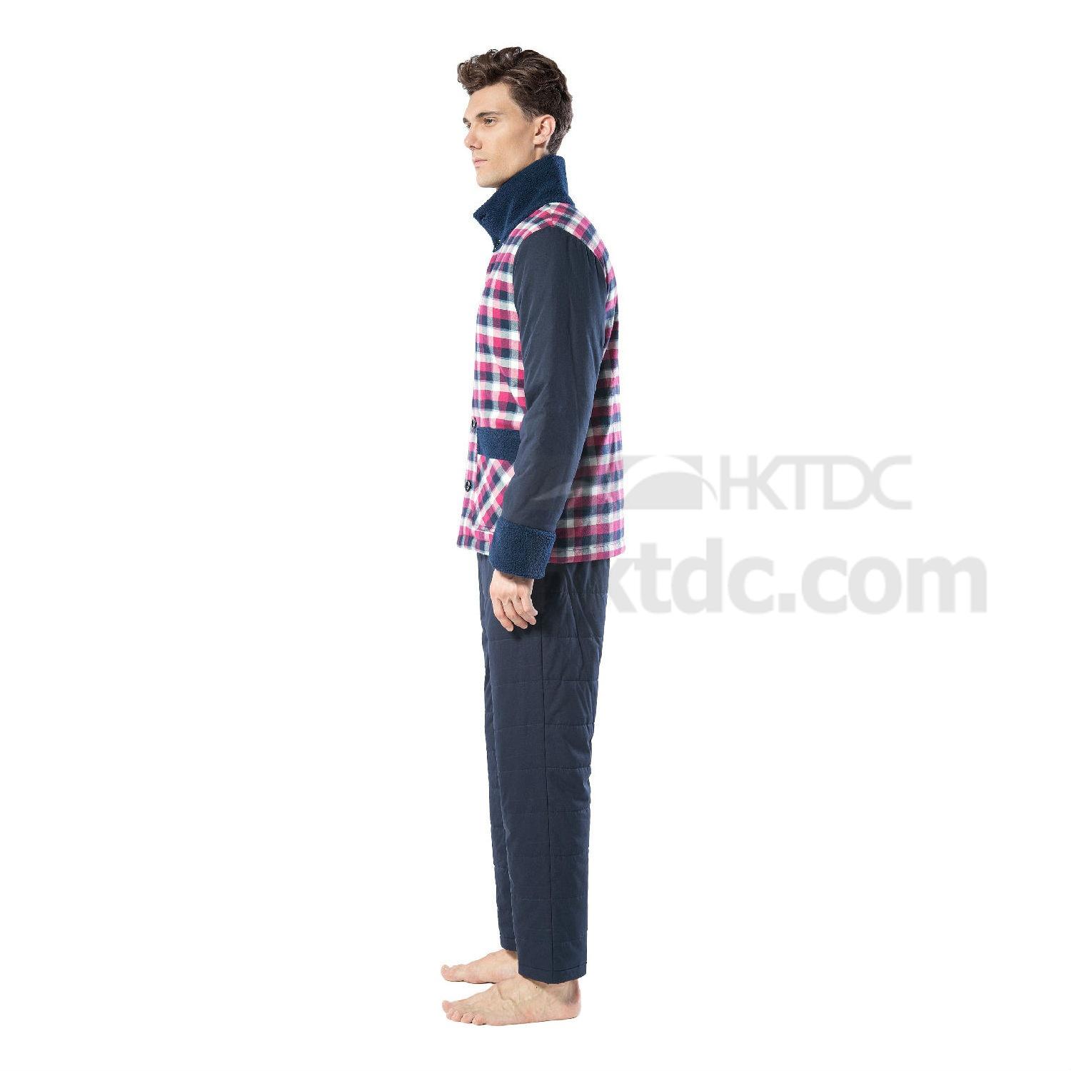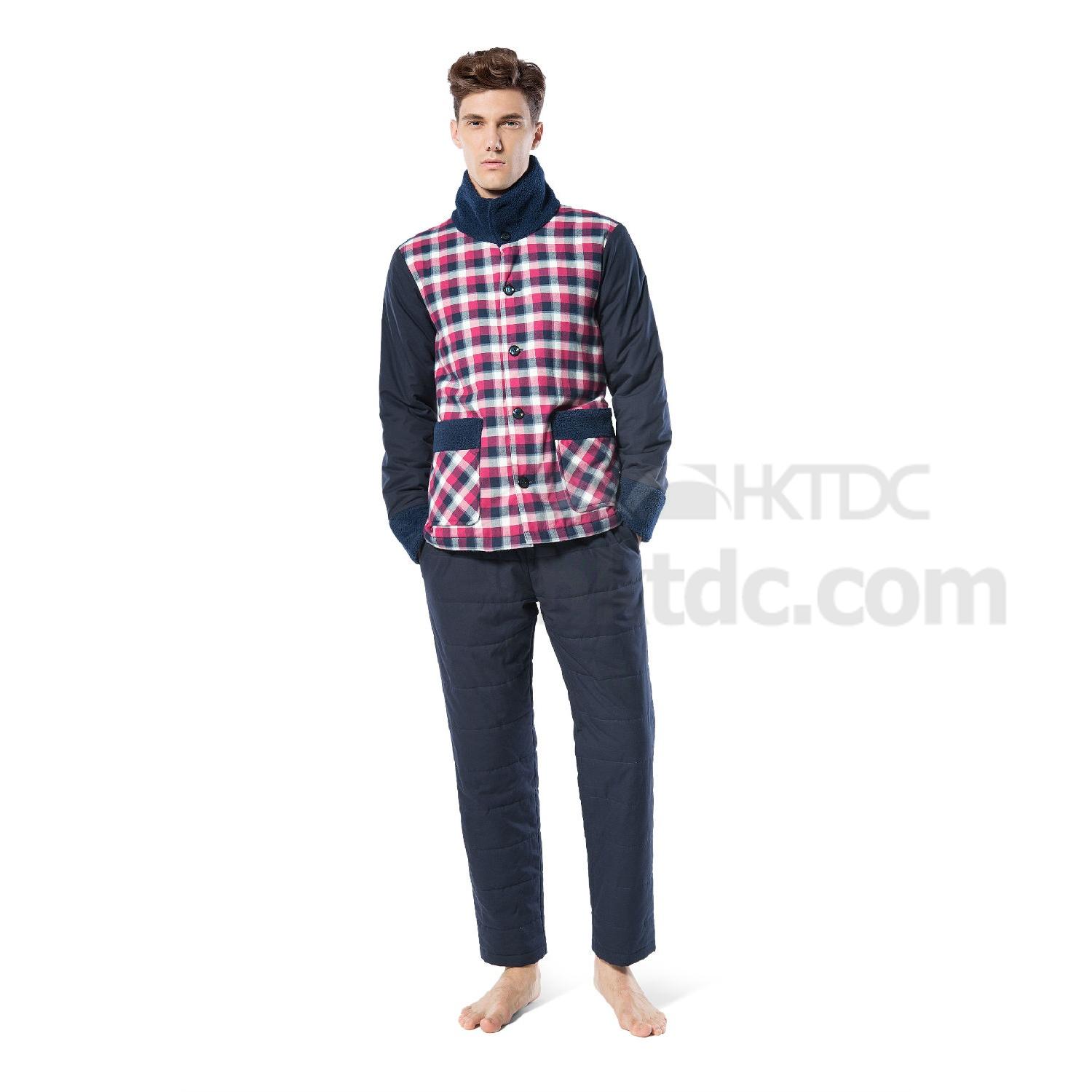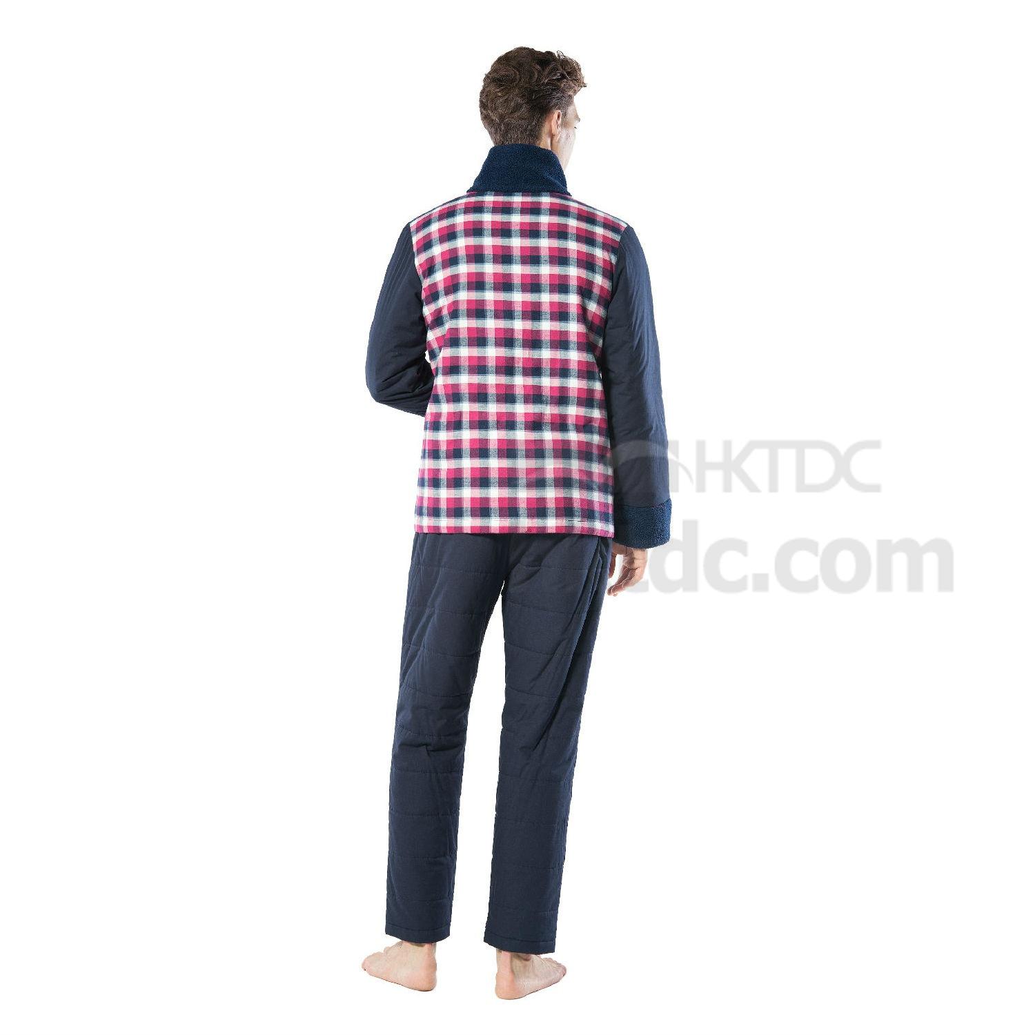 This men's cotton pajamas set comes with a checked jacket in red and black and a pair of black stuff pants. The stand collar of the jacket comes with an artificial lamb-wool collar face to keep your neck warm. The artificial lamb-wool details on the opening of patched pockets and cuffs make this jacket stand out from the rest.
