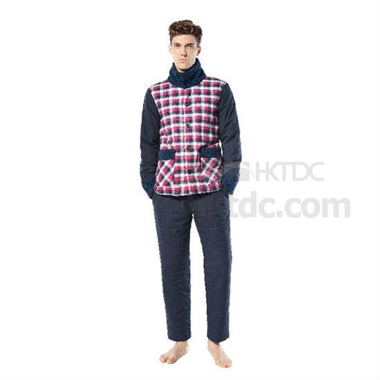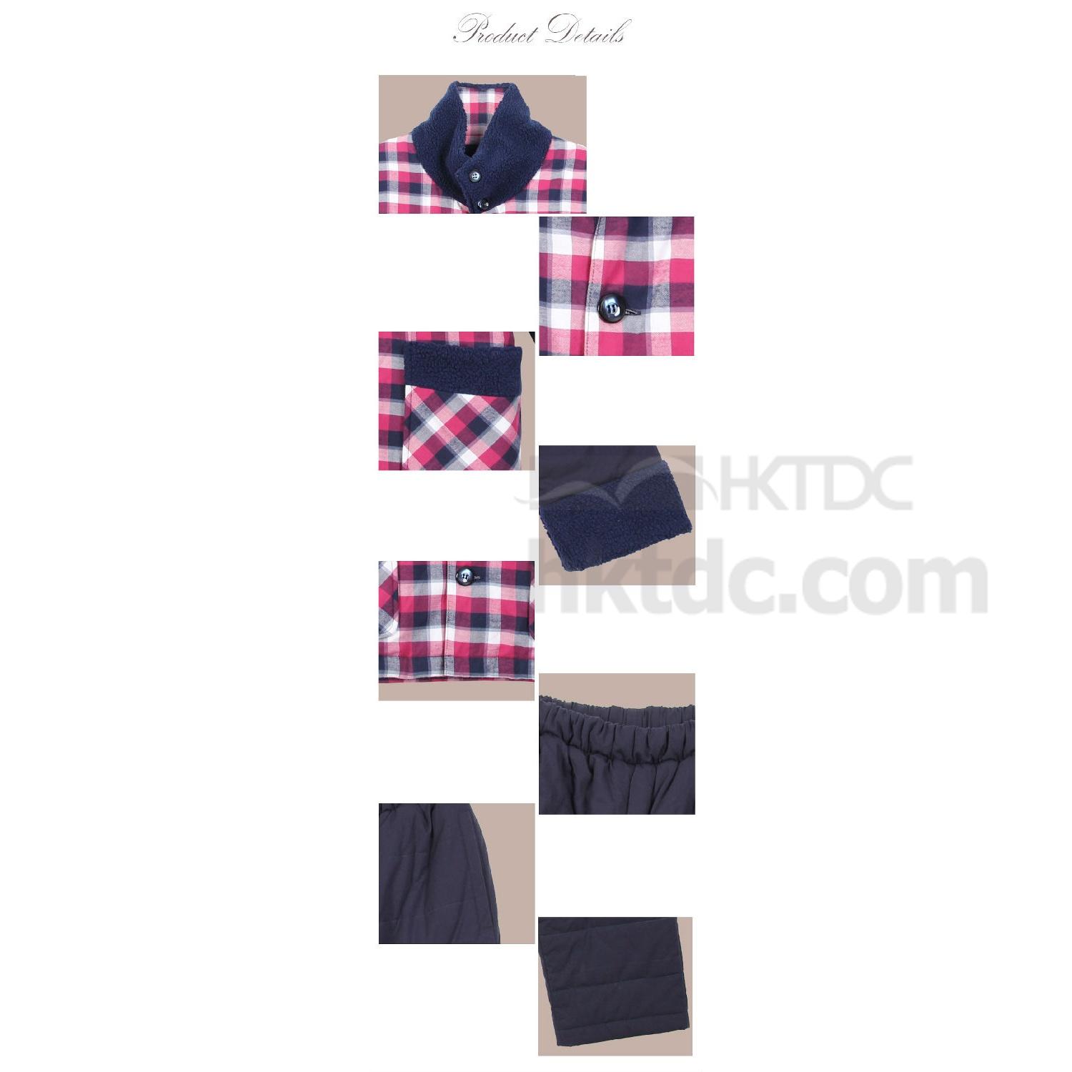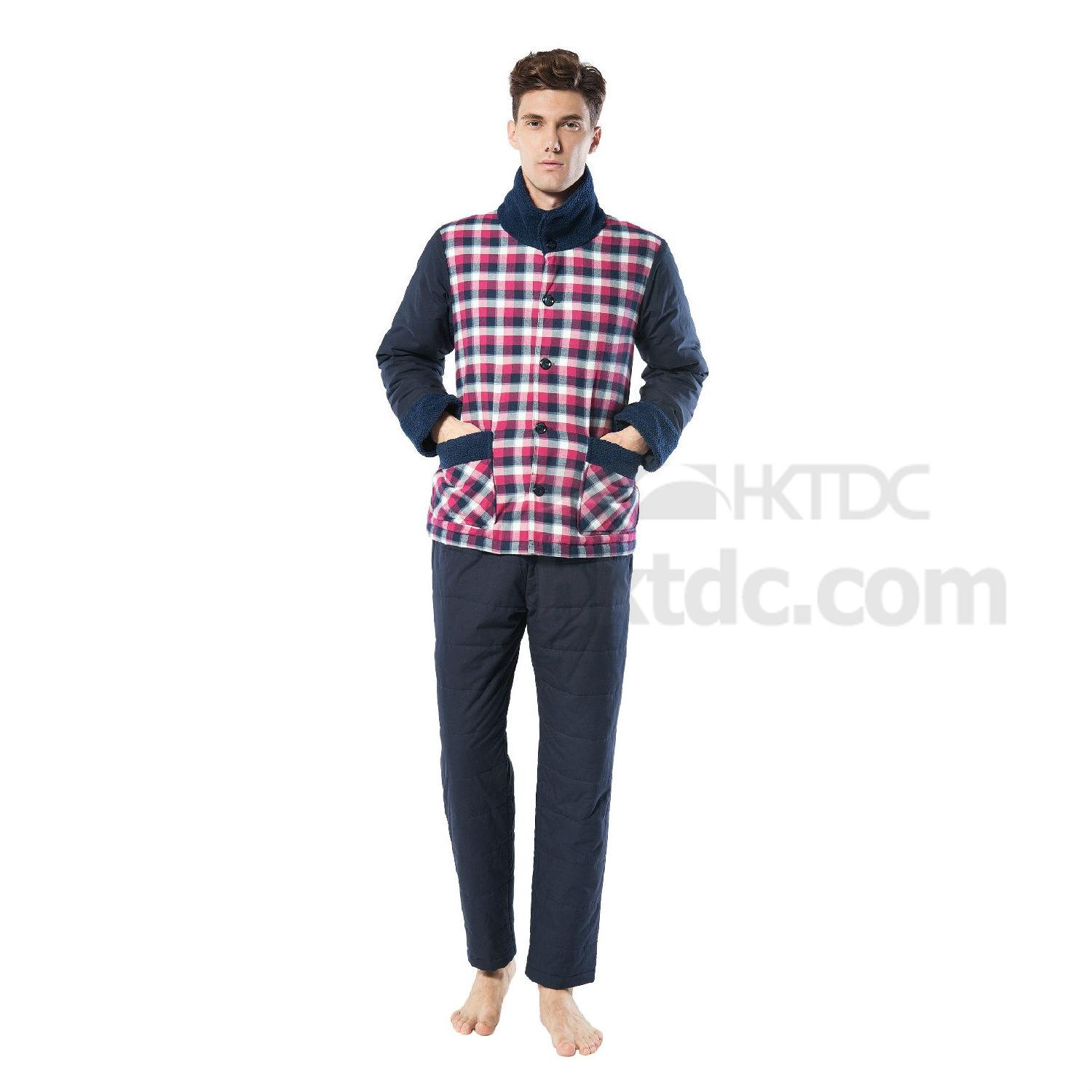 This men's cotton pajamas set comes with a checked jacket in red and black and a pair of black stuff pants. The stand collar of the jacket comes with an artificial lamb-wool collar face to keep your neck warm. The artificial lamb-wool details on the opening of patched pockets and cuffs make this jacket stand out from the rest.