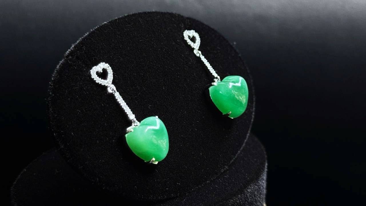 A striking blend of natural beauty and refined artistry, these drop earrings showcase two richly colored, heart-shaped jadeite cabochons. The stones dangle from an elegant line of brilliant diamonds, crowned by a dainty heart accent, creating a look that is both timelessly romantic and supremely graceful.
