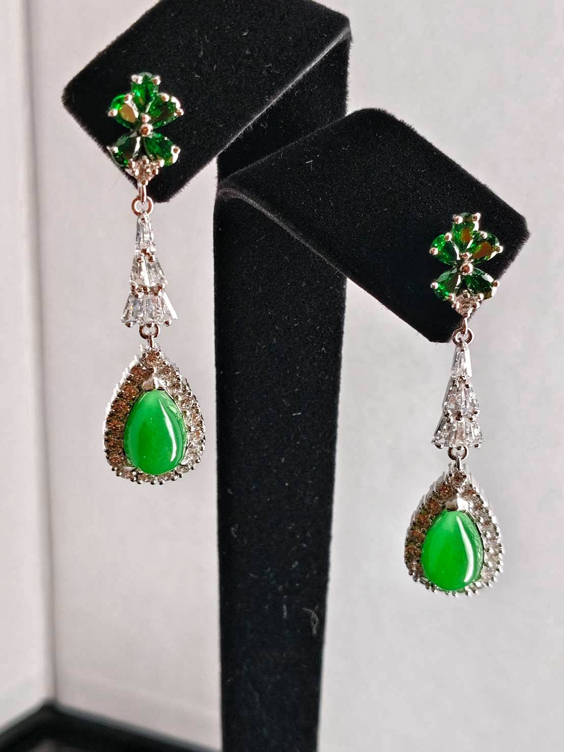 These jadeite earrings feature vibrant, translucent teardrop-shaped jadeite as the main stones, radiating freshness and brilliance. The surrounding delicate diamonds form an elegant teardrop frame that enhances their luxurious appeal. At the top, green gemstones create a floral motif, complemented by layered diamond accents that add movement and lightness to the design. Overall, the earrings exude a refined and graceful style, making them especially eye-catching when worn. These jadeite earrings feature vivid, translucent green cabochons that shine beautifully under the light. Above the main stones, sparkling small diamonds extend into a delicate floral motif, adding a romantic and elegant touch. The lightweight, dangling design moves gracefully with each motion, enhancing their lively charm and showcasing refined craftsmanship and sophisticated style.