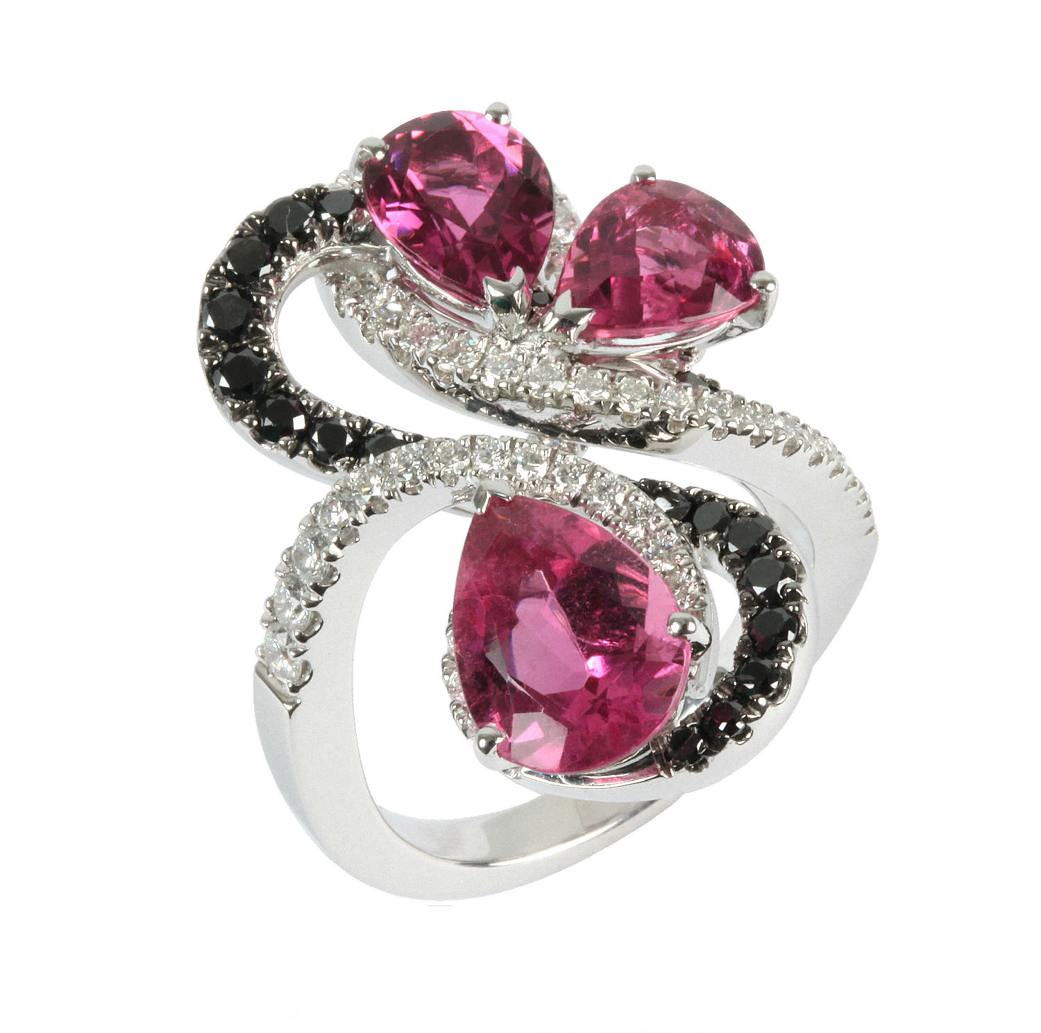 • Pink Tourmaline (6,68 ct), Black Diamonds (0,72 ct) and White Diamonds (0,97 ct) Ring, White Gold