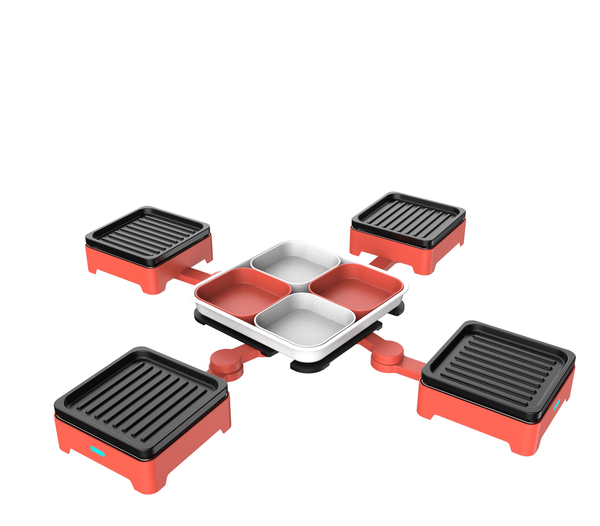 Can freely match A main tray and four small plates Non-stick coating grill Easy assembly easy to clean Metal reflector plate, stainless steel heat pipe Space saving Can be used by many people at the same time, Taste True Life