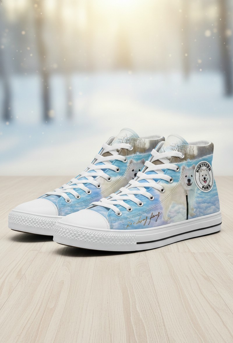 Inspired by a serene winter snowscape, these high-top canvas sneakers feature a soft palette of blue skies and white snow that feels incredibly healing. The most eye-catching element is the vivid dog motif, whose innocent charm—paired with a delicate artistic signature—brings a warm, human touch to the classic high-top silhouette.
