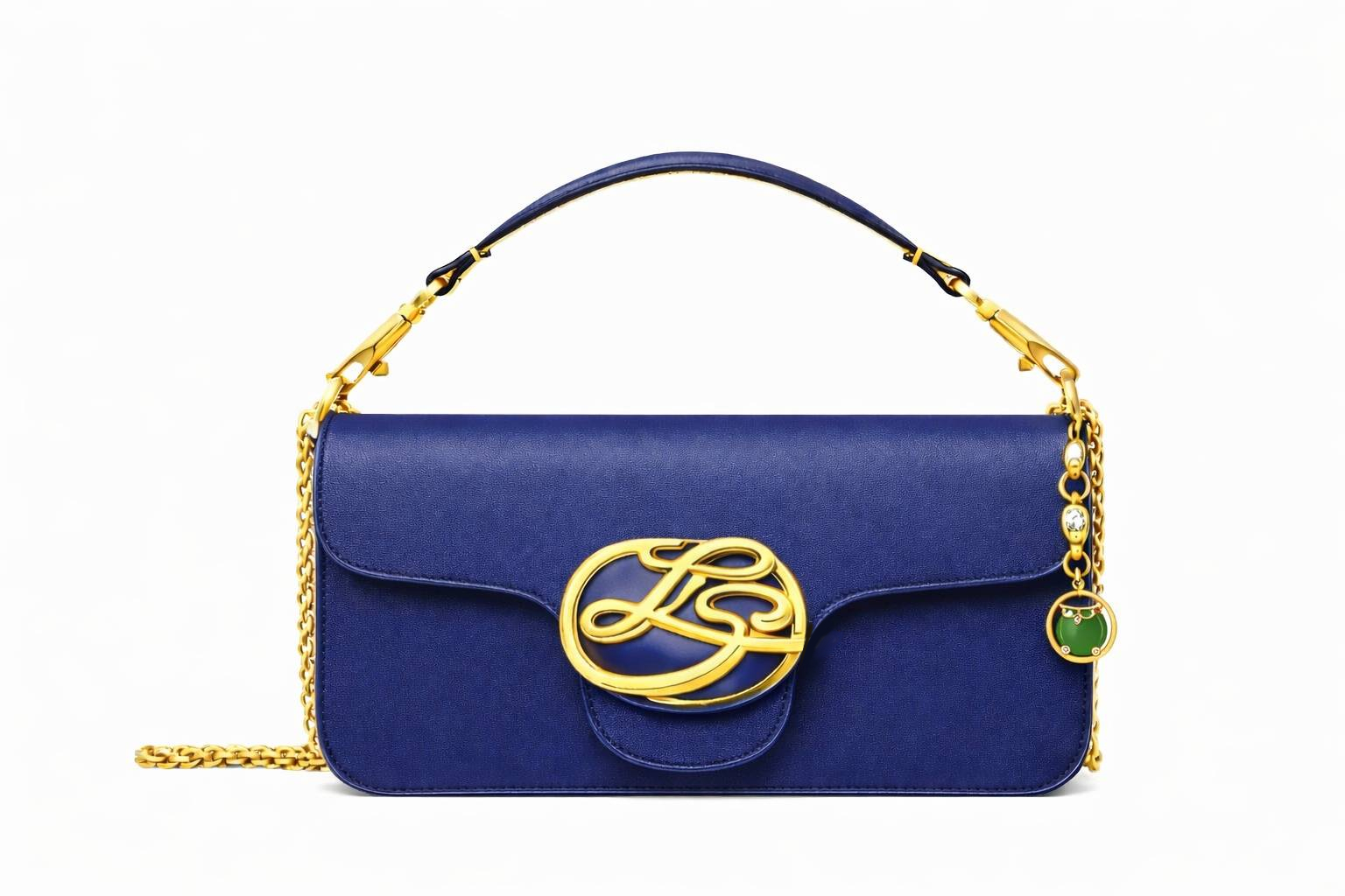 Crafted from premium supple leather and adorned with an iconic golden geometric emblem, the most enchanting feature is the exquisite emerald charm nestled within the details.