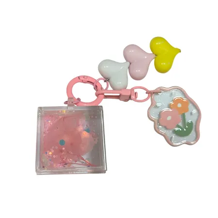 This keychain's design seems inspired by a combination of cuteness and whimsy. The square part with floating elements inside likely draws inspiration from the trend of items with moving or floating components, which can be visually captivating and add an element of fun. The flower - shaped charm with a floral design on it is reminiscent of nature and beauty, bringing a touch of elegance and a connection to the natural world. The heart - shaped embellishments add a symbol of love and affection. Overall, it aims to create a keychain that is both a practical item and a charming accessory, appealing to those who enjoy cute and decorative objects.