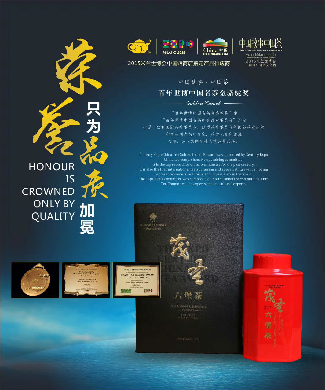 “Golden Camel Prize” in Expo Milan 2015-Italy, one of the top award in China Tea Industry.Tea is using year 2005, aging more than 12 years, represented the unique characteristics of liupao tea‘red, strong, aged, mellow’