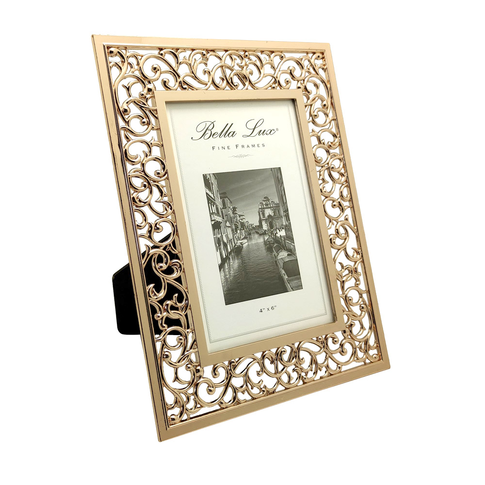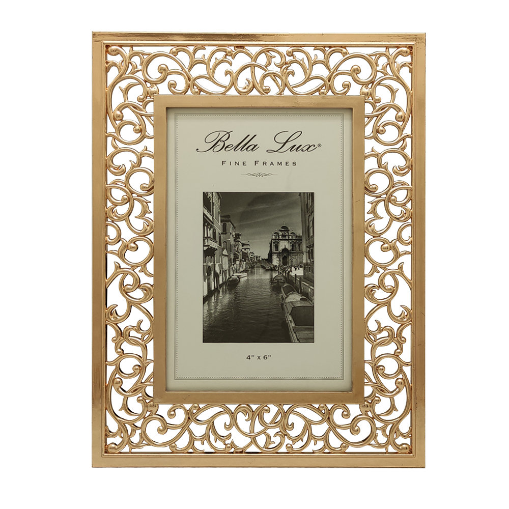 Made with a fine, intricate vine design, this photo frame has a gold finish.