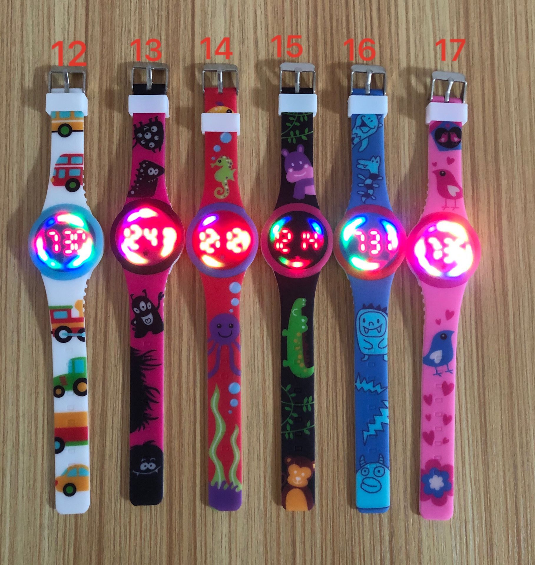 • Digital LED watch in silicone, round shape watch head with digital print pattern on strap.