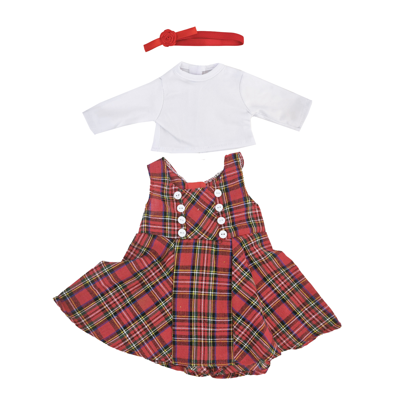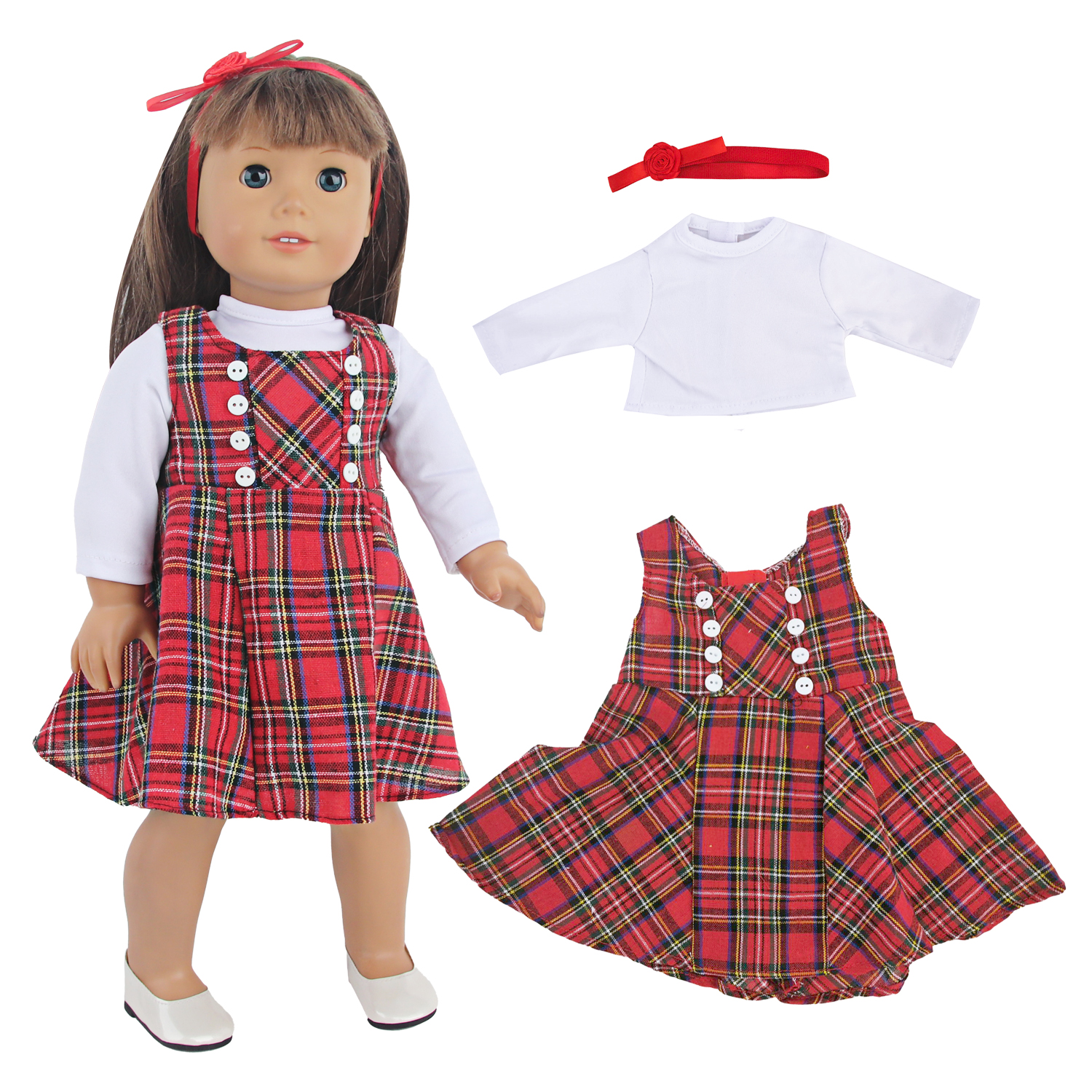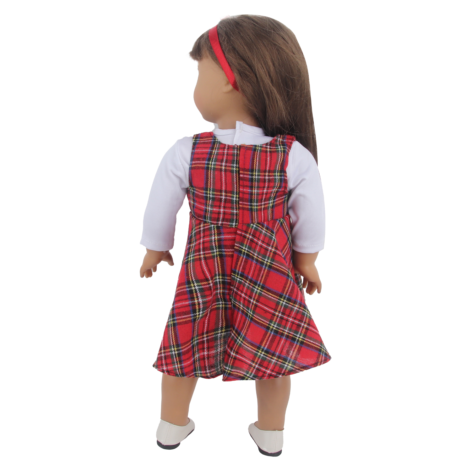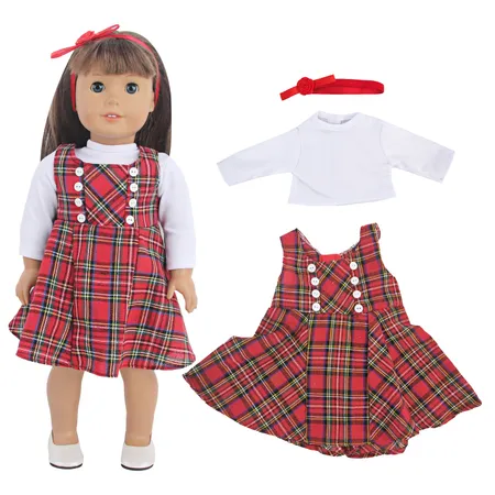 MYSO OEM ODM Custom 18 Inch Doll Clothes Plaid Dress Set with White Long Sleeve Shirt & Headband for American Girl Dolls Wholesale
