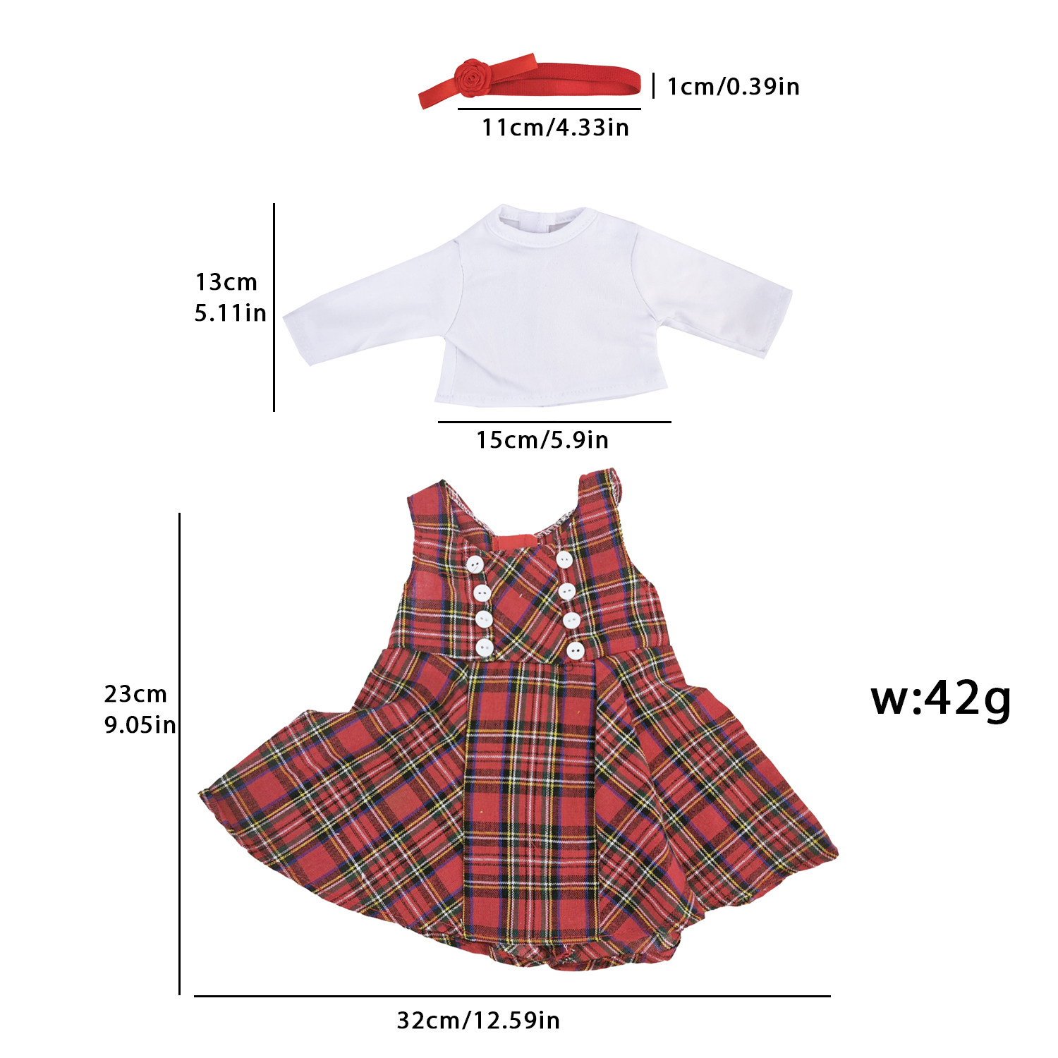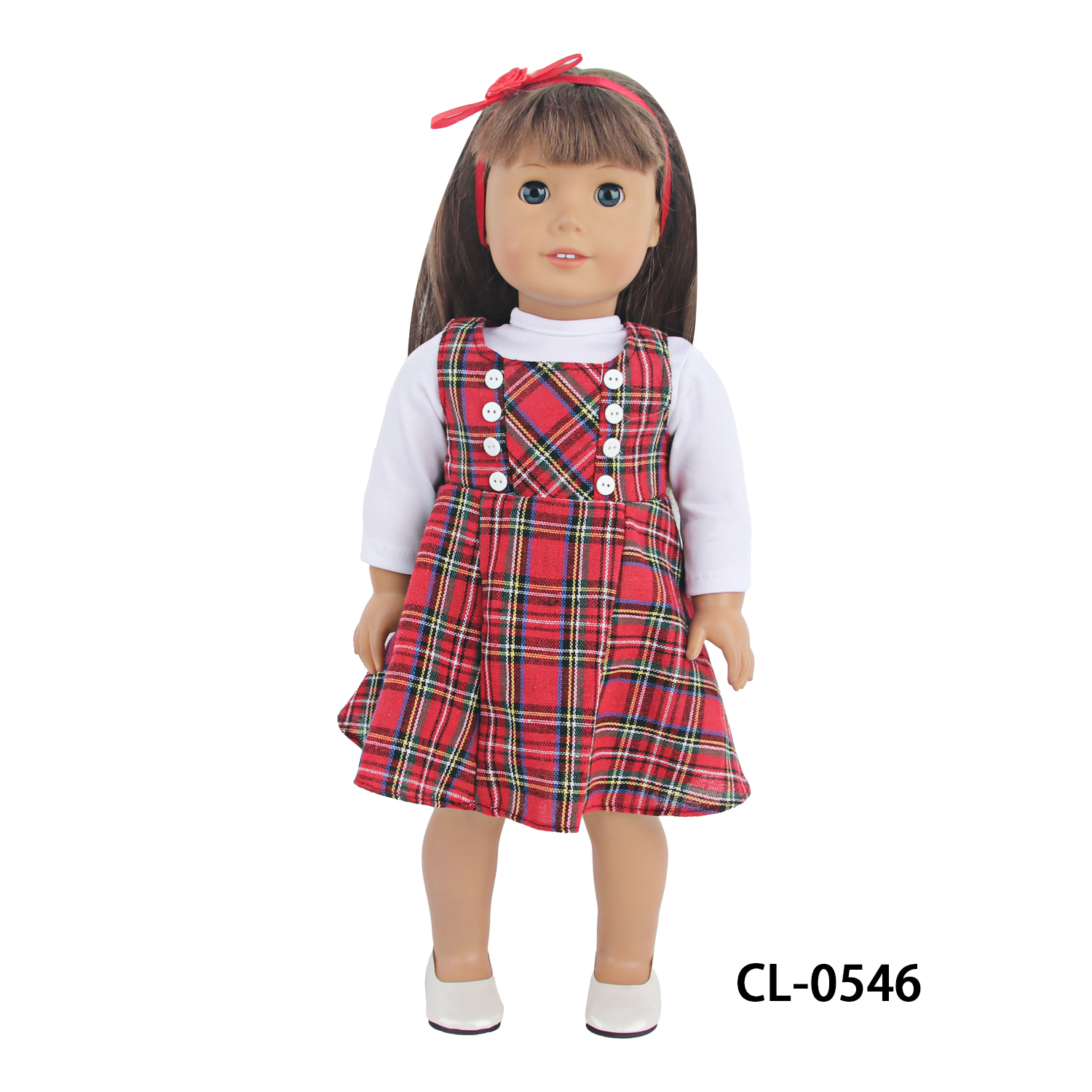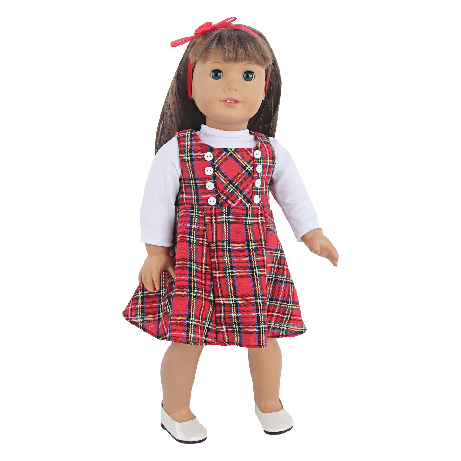 MYSO OEM ODM Custom 18 Inch Doll Clothes Plaid Dress Set with White Long Sleeve Shirt & Headband for American Girl Dolls Wholesale