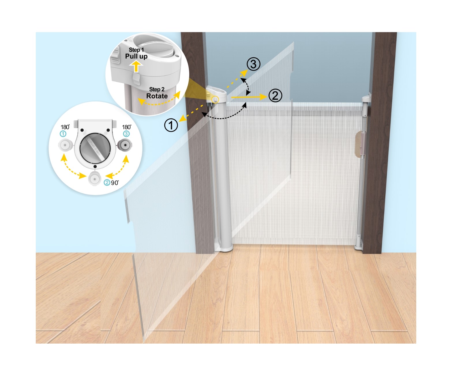 Easy to install at the door or stairs to prevent children entering into kitchen, bathroom, going to dangerous areas, multi directions locking system, strong aluminum case , reliable structure for home use to safe guard children.