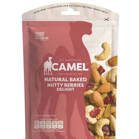 Camel natural baked ruby mix with premium ingredients of cashews, almond, mulberries and cranberries.