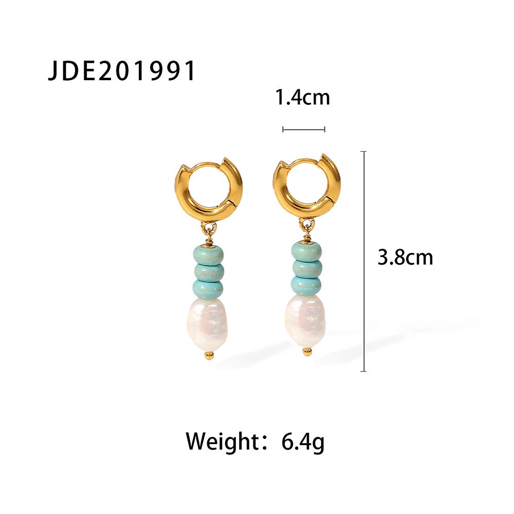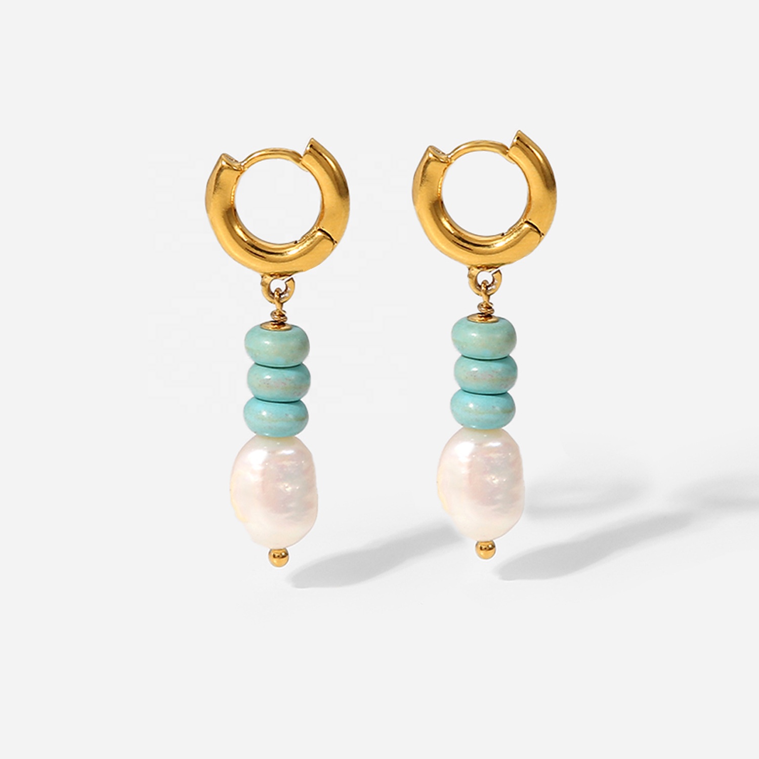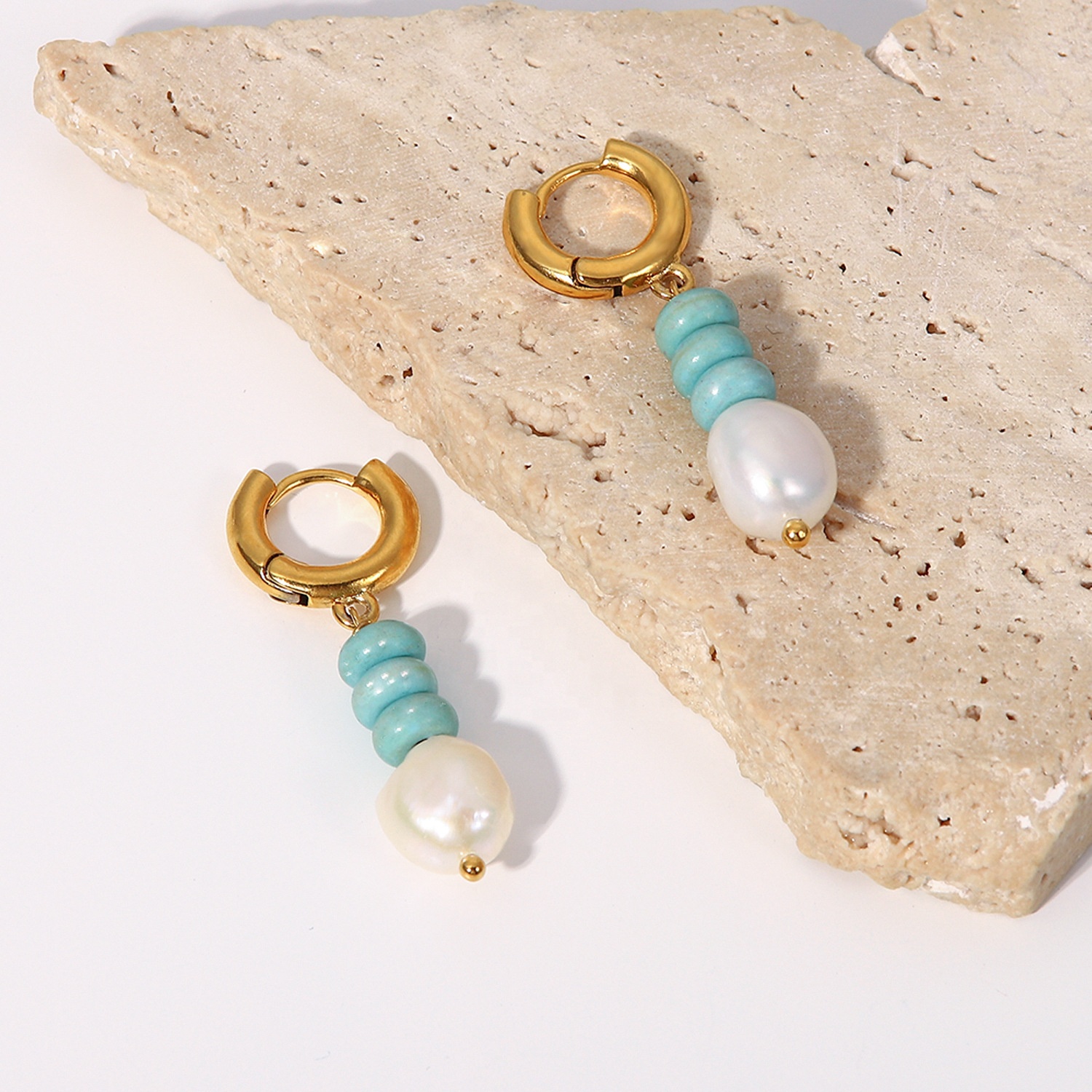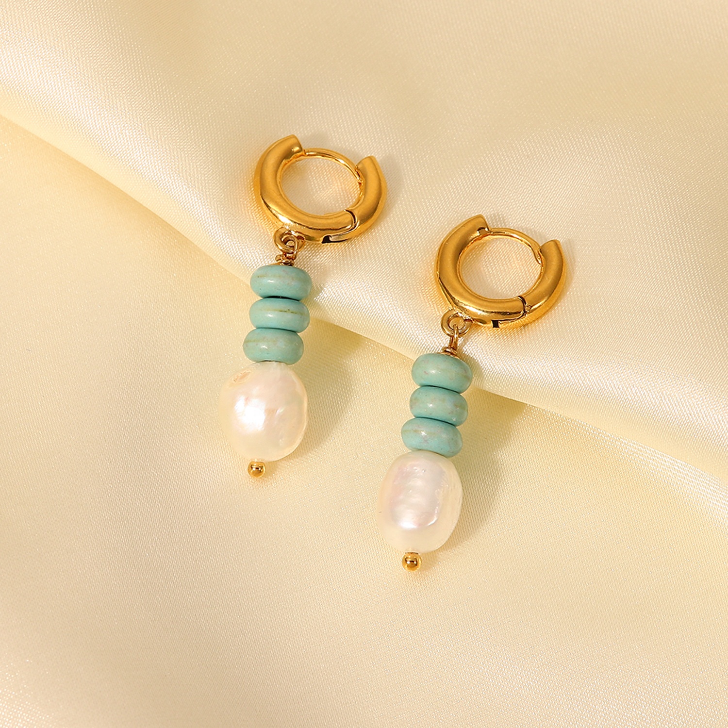 New 18k Gold Stainless Steel Natural Stone Turquoise Pearl Pendant Hoop Earrings Women's Girls Travel Party Jewelry