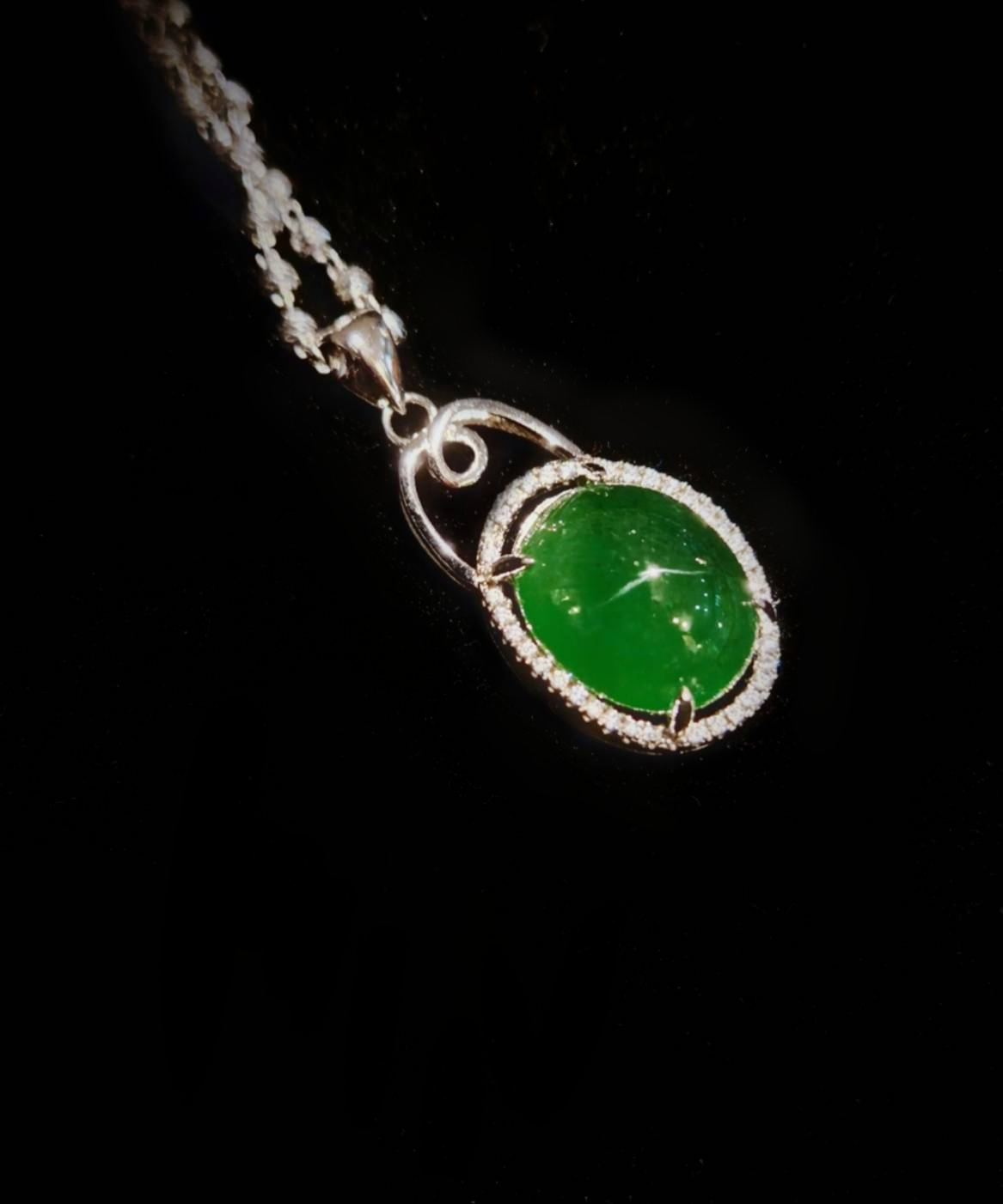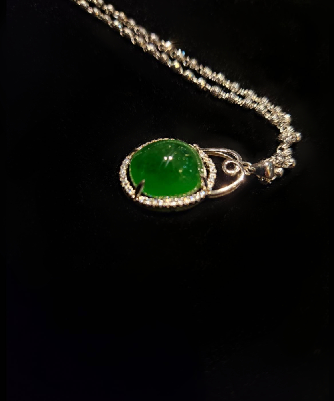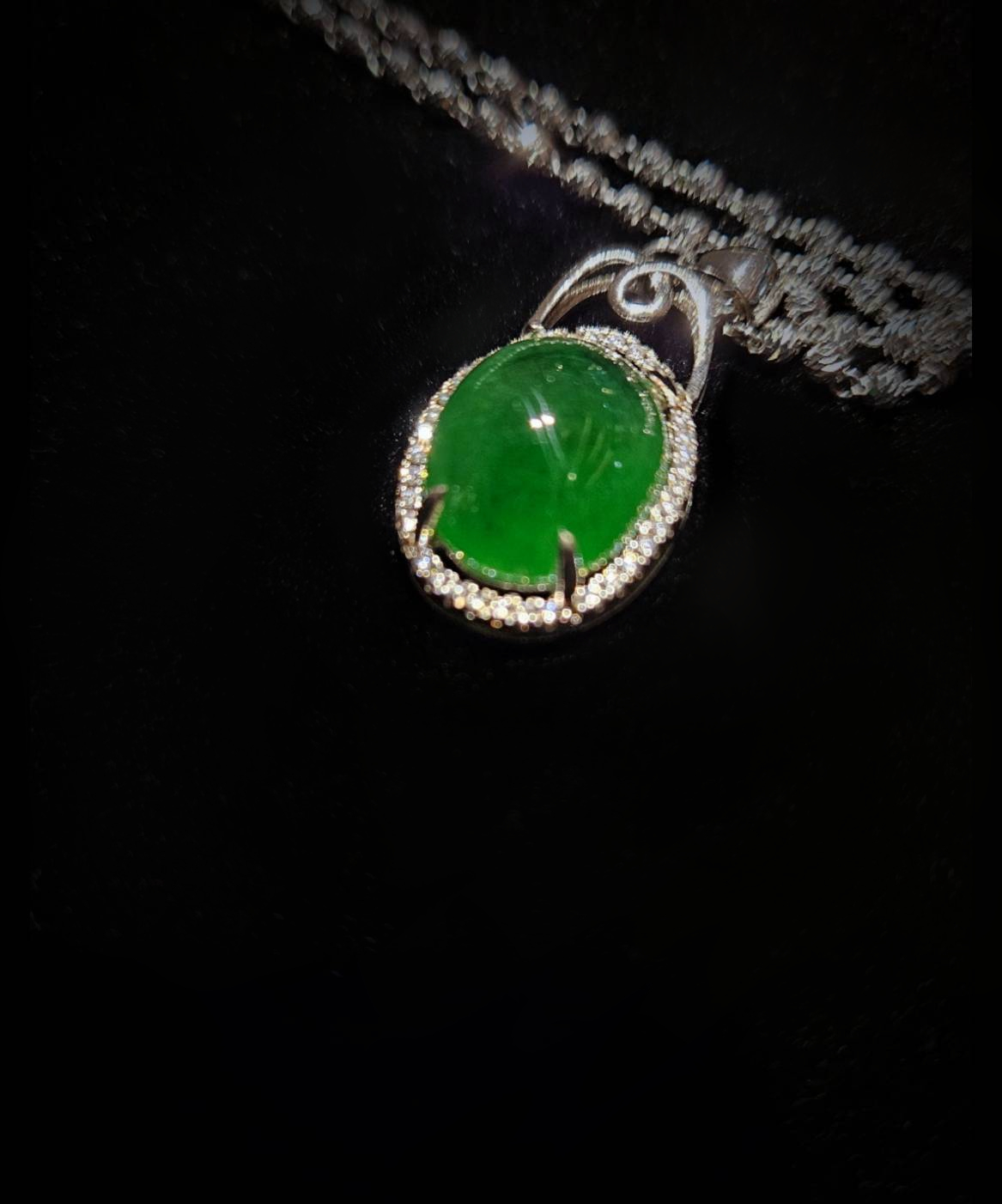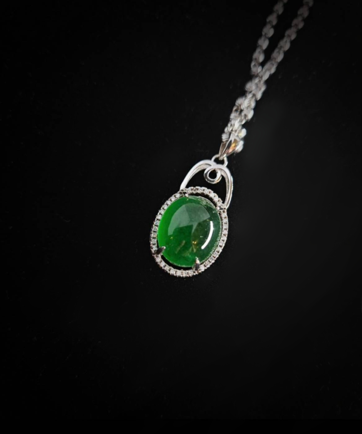 The main stone is encircled by a dazzling halo-like border, forming a refined setting design. This halo is meticulously paved with small, brilliant accent stones, emphasizing the elegant contour of the jadeite. The bail at the top is simple and graceful, featuring flowing, curved details, and suspends the pendant from a slender chain. The overall design is classic and luxurious, perfectly blending the natural beauty of the jadeite with the metal's brilliance.