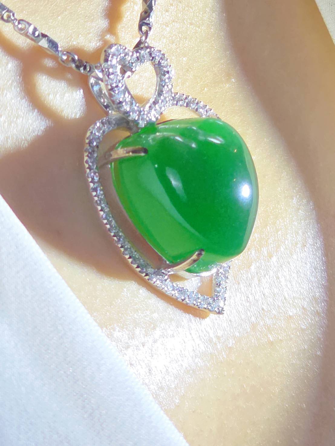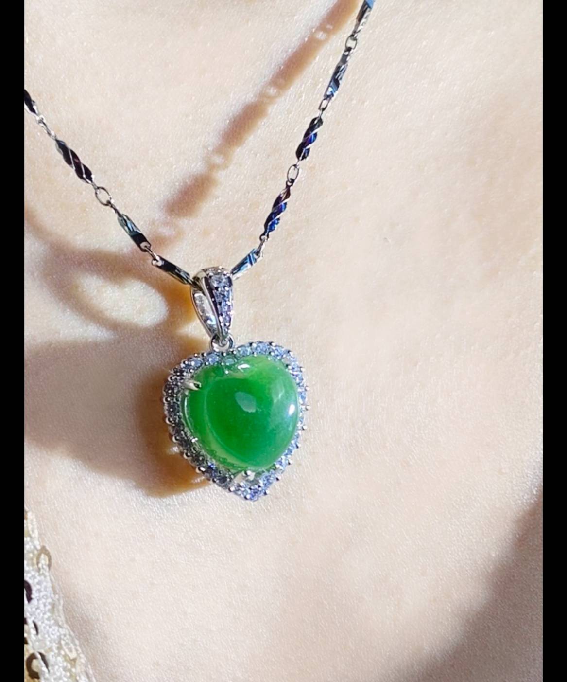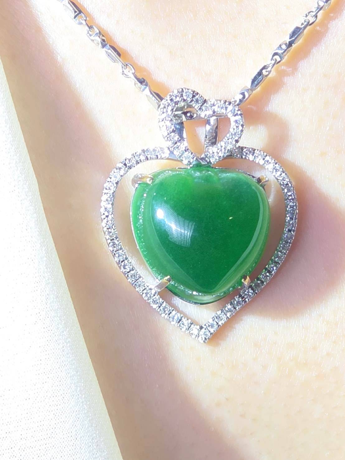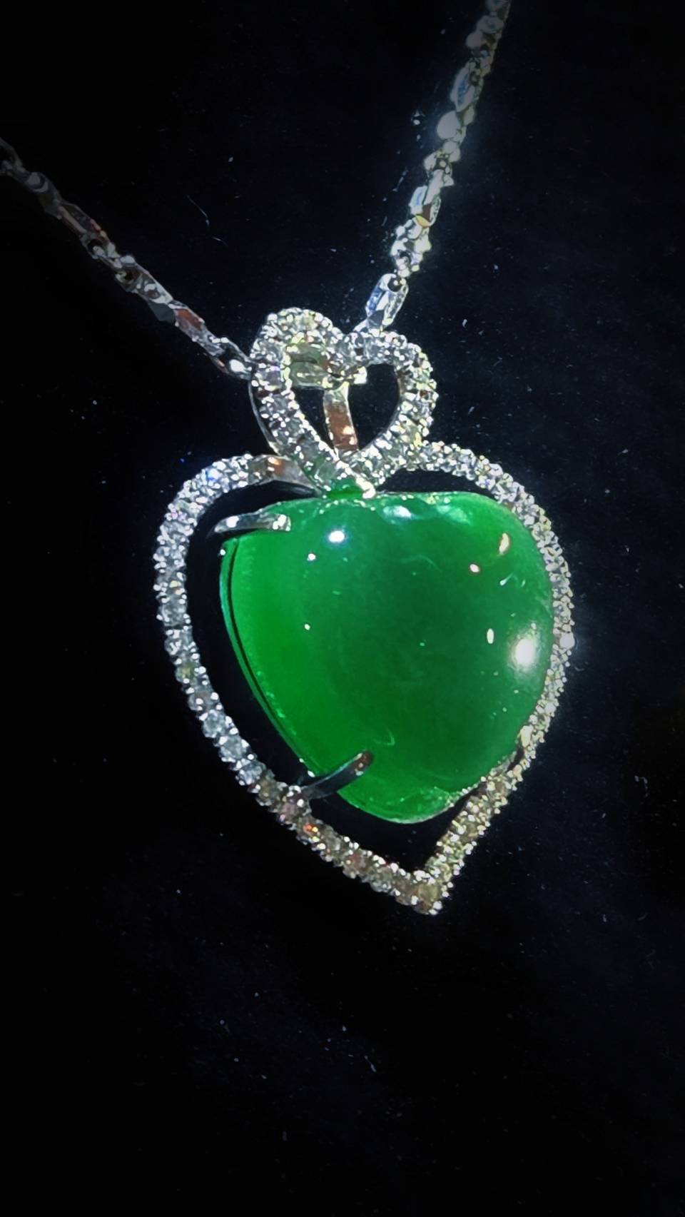 The outer heart outline is fully paved with tiny, brilliant accent stones, whose dazzling sparkle enhances the vibrant green of the central jadeite, creating a luxurious and romantic feel. The pendant hangs from an accent-studded heart-shaped bail on a delicate chain. The overall design is sweet and meaningful, making it a very feminine piece of jewelry.