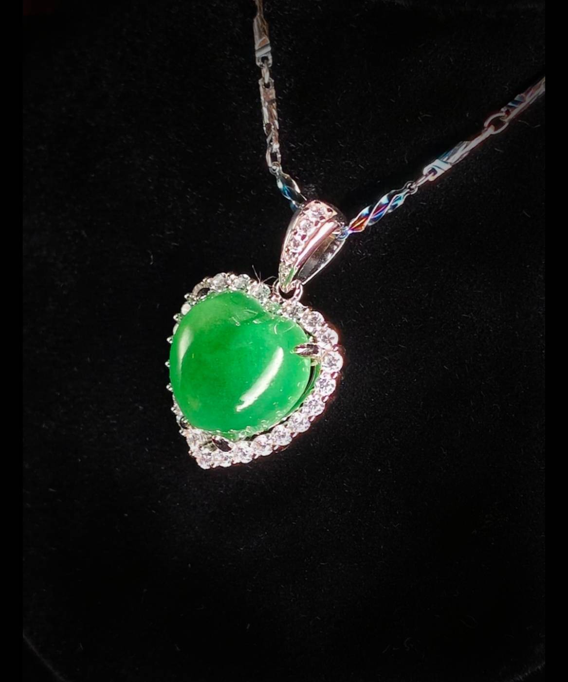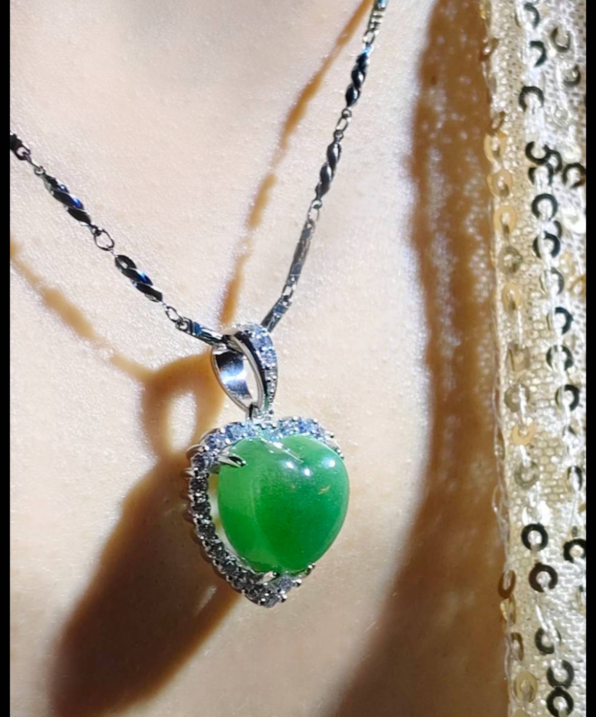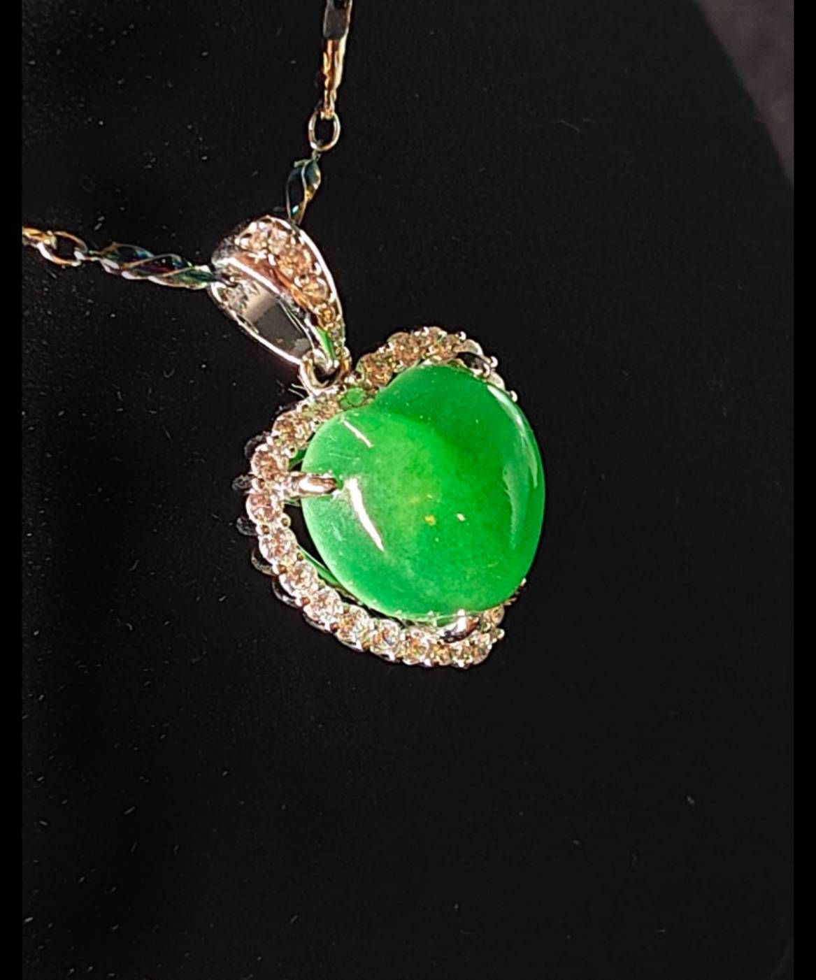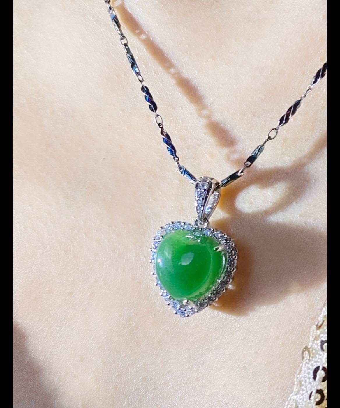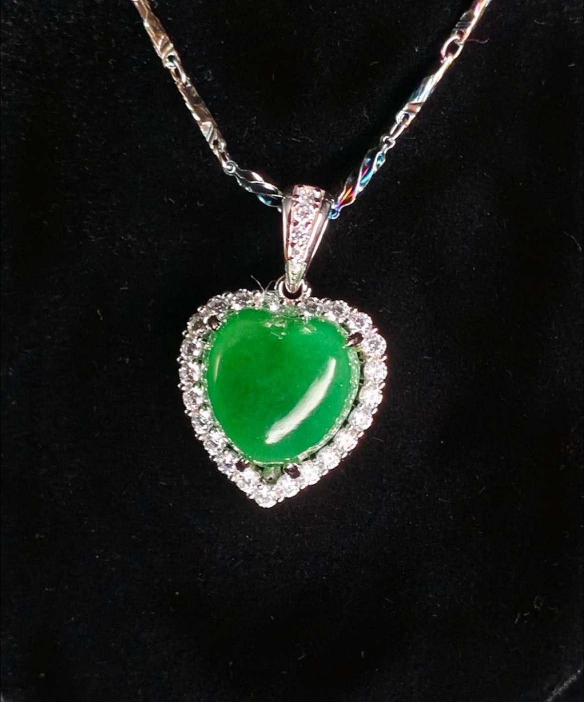 The outer heart outline is fully paved with tiny, brilliant accent stones, whose dazzling sparkle enhances the vibrant green of the central jadeite, creating a luxurious and romantic feel. The pendant hangs from an accent-studded heart-shaped bail on a delicate chain. The overall design is sweet and meaningful, making it a very feminine piece of jewelry.