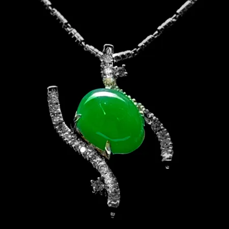 This necklace centers on a full, rounded oval green jadeite cabochon, whose smooth surface emits a gentle luster. The jadeite is mounted horizontally within a unique, open framework full of kinetic energy.
