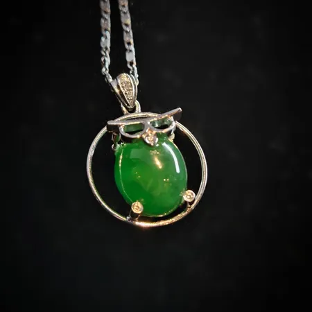 This adorable pendant necklace features a whimsical owl design that is both stylish and meaningful. The owl's body is represented by a smooth, plump, oval cabochon of vibrant green jadeite. The jadeite possesses a rich, luminous color and a high polish, making it a captivating focal point that symbolizes wisdom and good fortune.