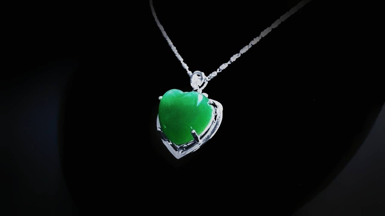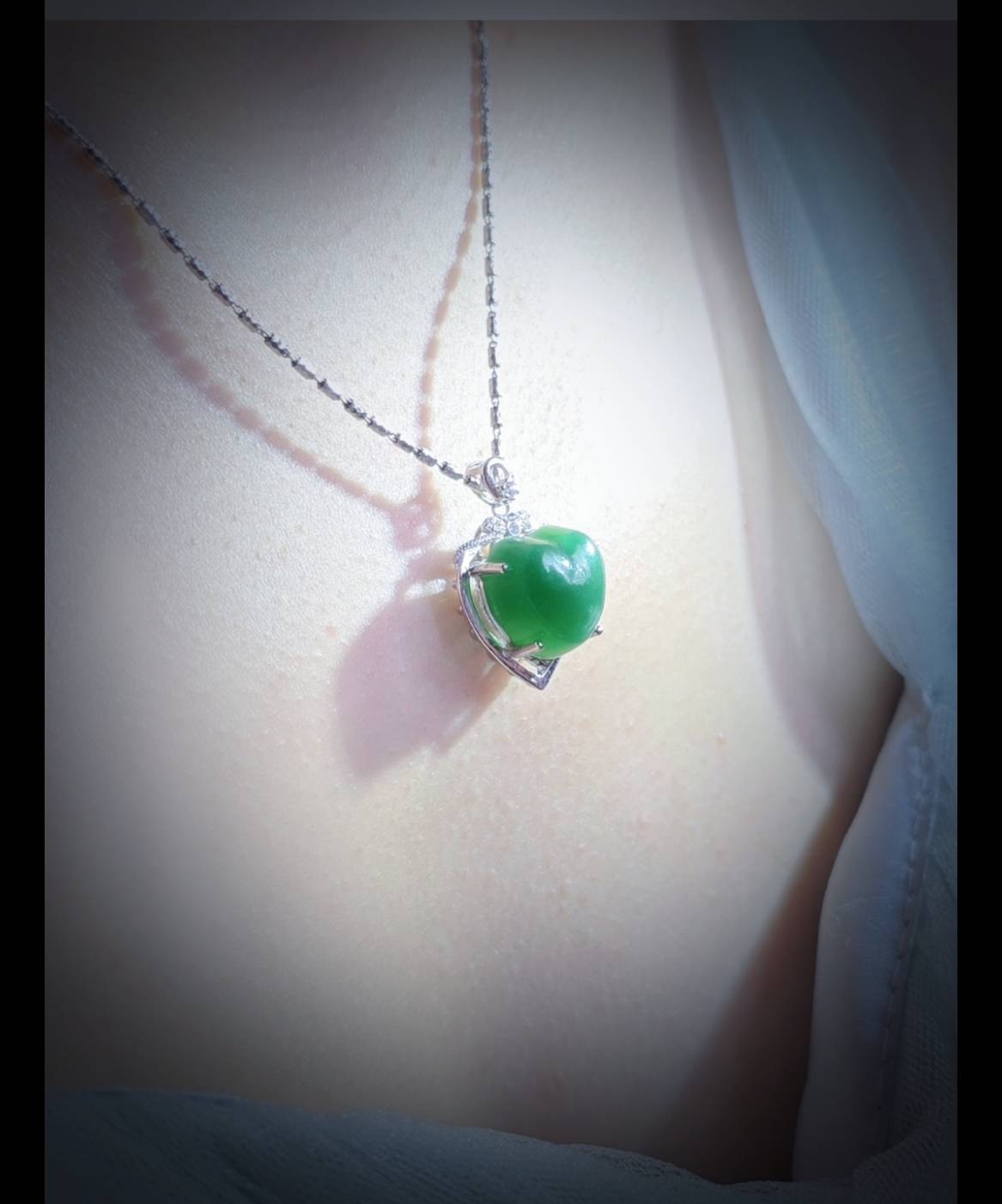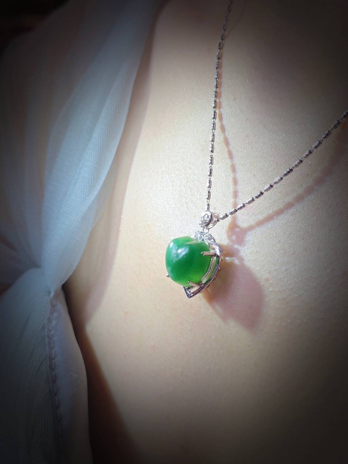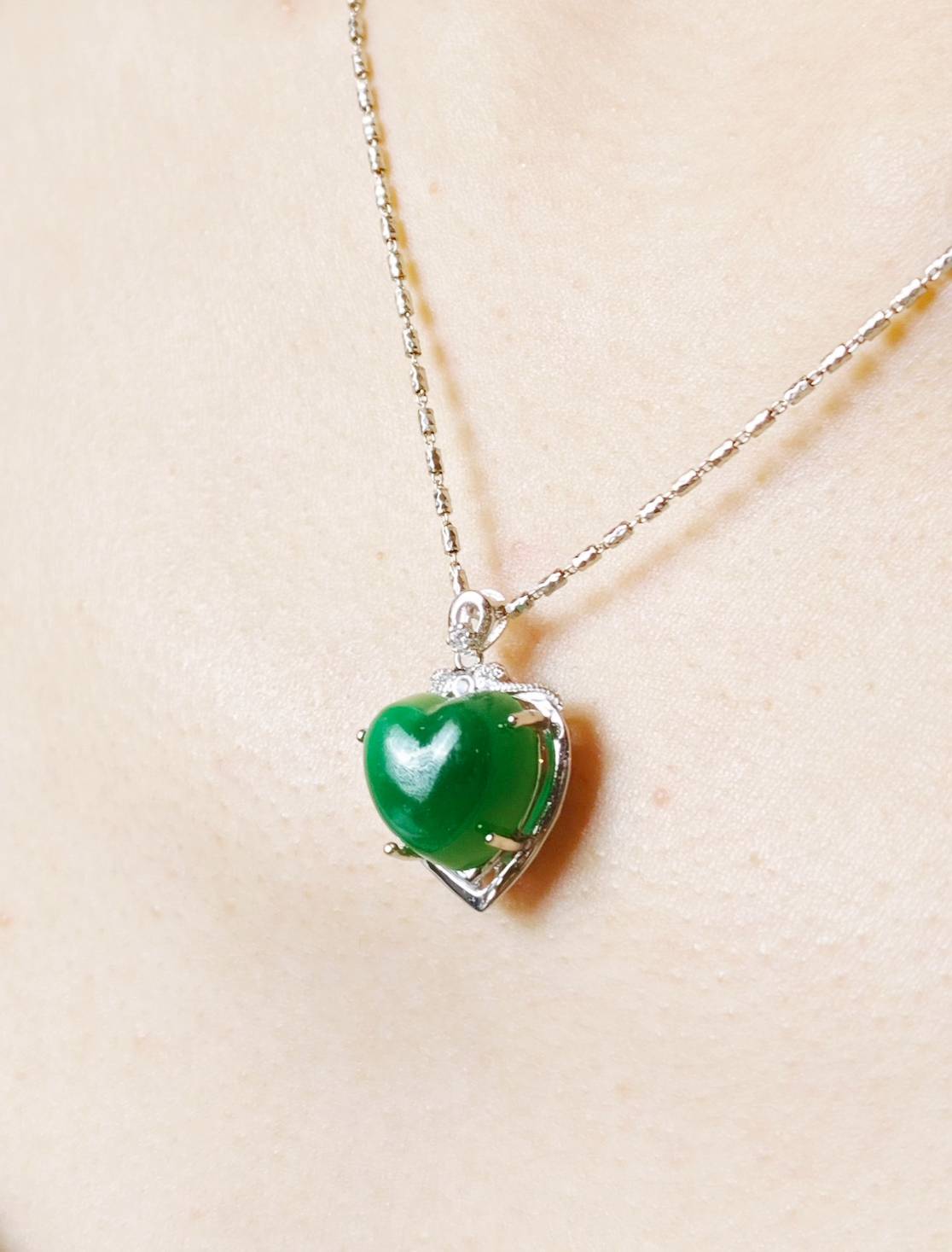 This charming pendant necklace features a timeless and romantic design. The focal point is a plump, highly polished heart-shaped cabochon of vibrant green jadeite. The jadeite exhibits a beautiful, rich hue and is securely held by a minimalist white-metal setting that follows the contours of the heart.