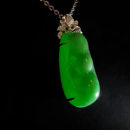 This elegant pendant necklace features a striking, elongated piece of vibrant green jadeite, carved in the auspicious shape of a green bean pod (or Fu Dou), symbolizing fertility and good fortune. The jadeite exhibits rich color and a smooth polish.
