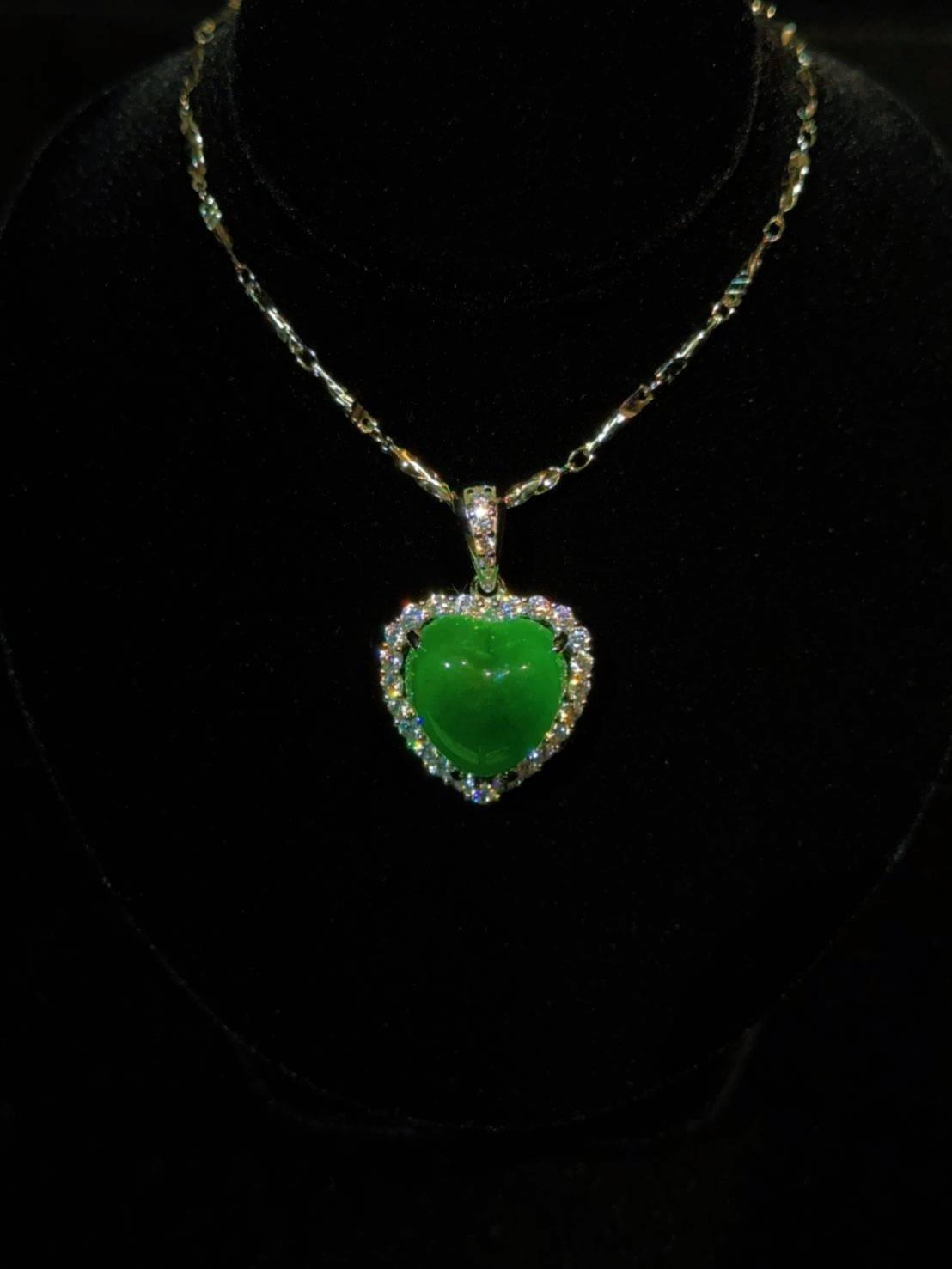 This opulent pendant necklace features a timeless and romantic heart motif. The focal point is a plump, highly polished heart-shaped cabochon of vibrant green jadeite. The jadeite stone is captivating, exhibiting a rich, luminous hue and smooth, flawless surface.