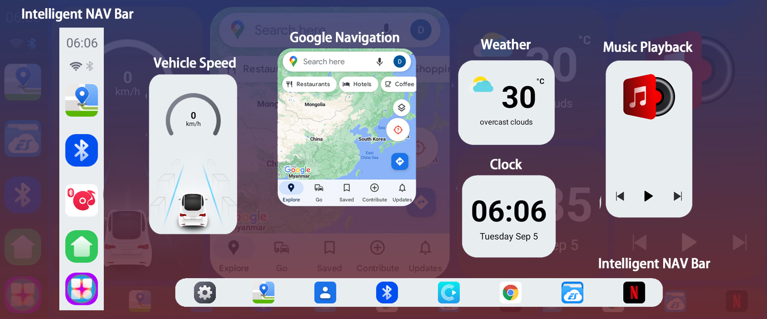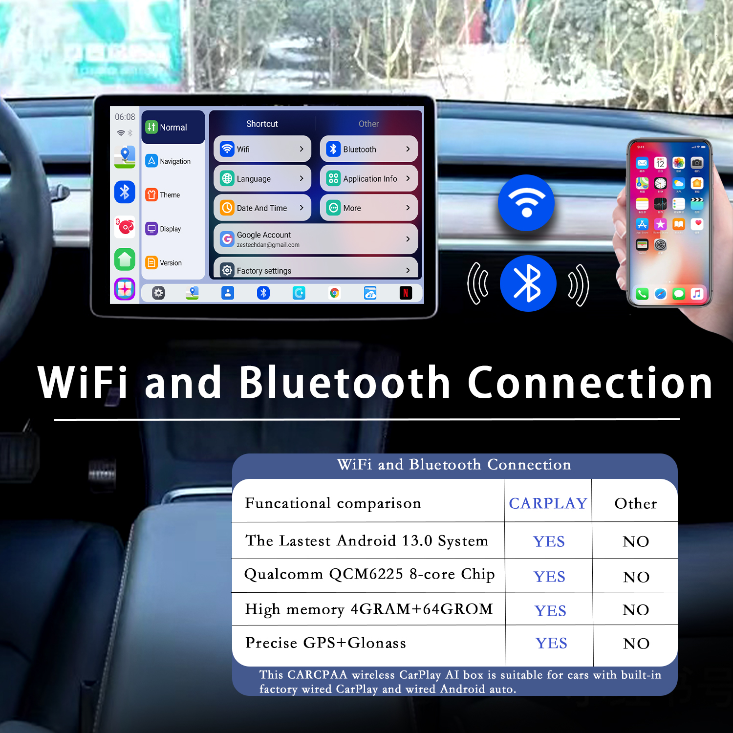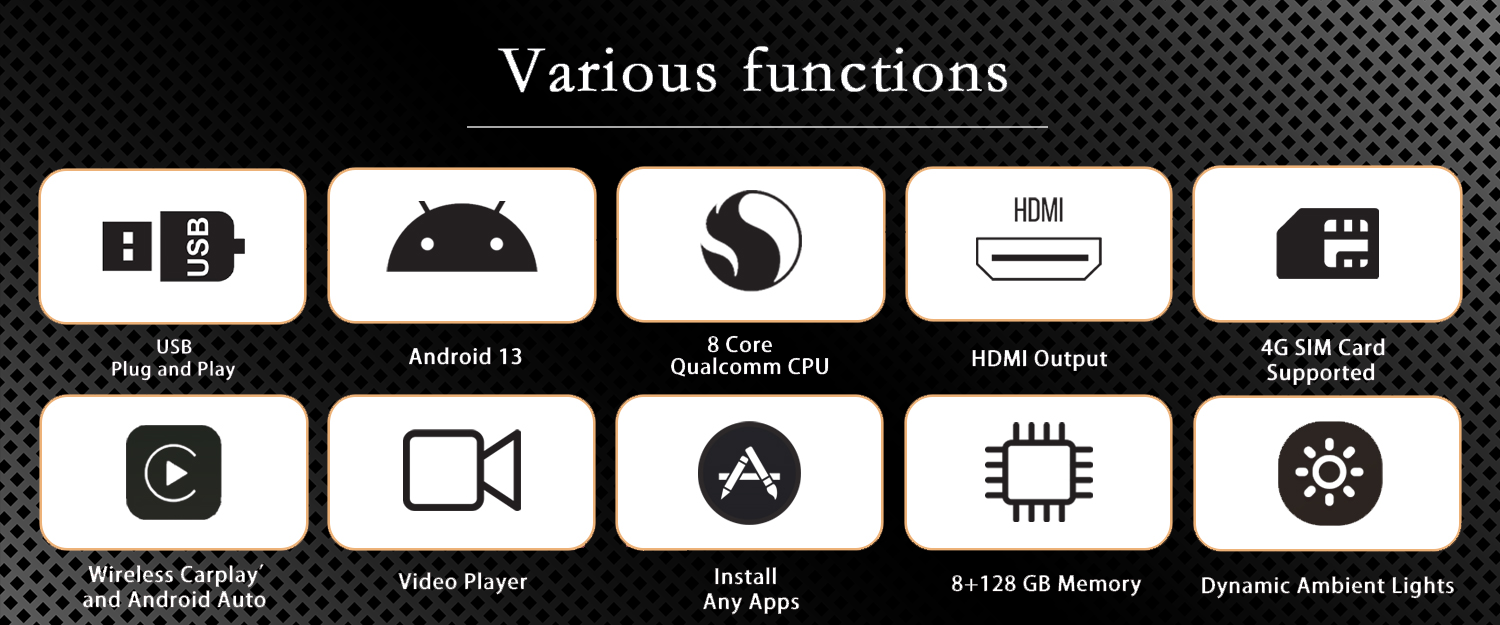 Qualcomm SM6115 is a solution with four A73 and 4 A53 cores, it is with extremely high cost performance, can support wireless CarPlay and Android Auto, and can allow you enjoy Android 13+ version system with full apps from Google Playstore.