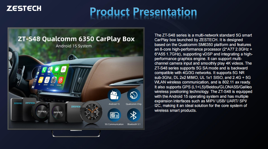 Qualcomm SM6350 is a solution with Dual-core ARM Cortex™-A77, 2.0GHz + Six-core ARM Cortex™- A55,1.7GHz,8nm technology, it is a top-end solution with extremely excellent performance, can support wireless CarPlay and Android Auto, and can allow you enjoy real Android 15 version system with full apps from Google Playstore, additionally it supports HDMI In and out, and support 5G soc.