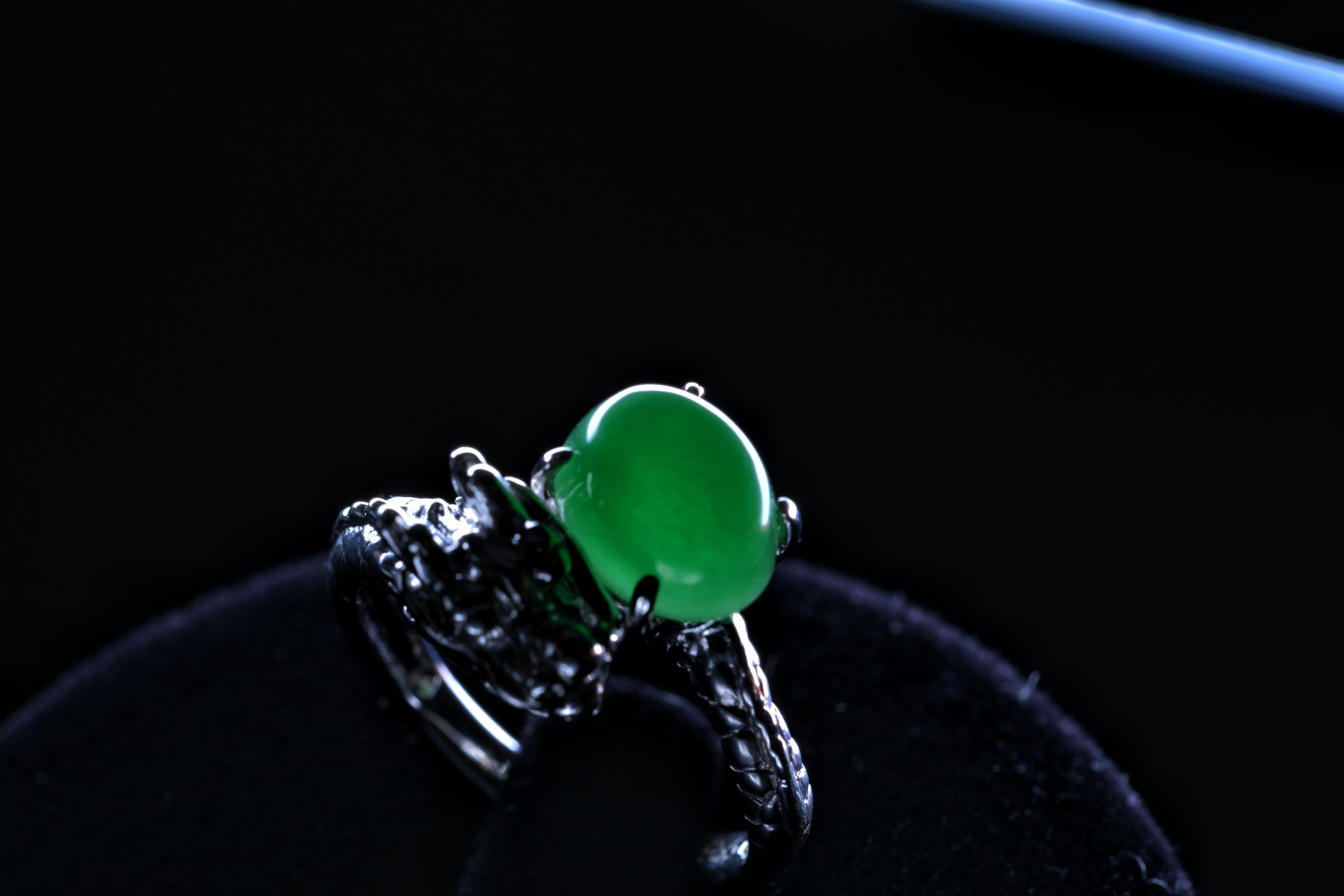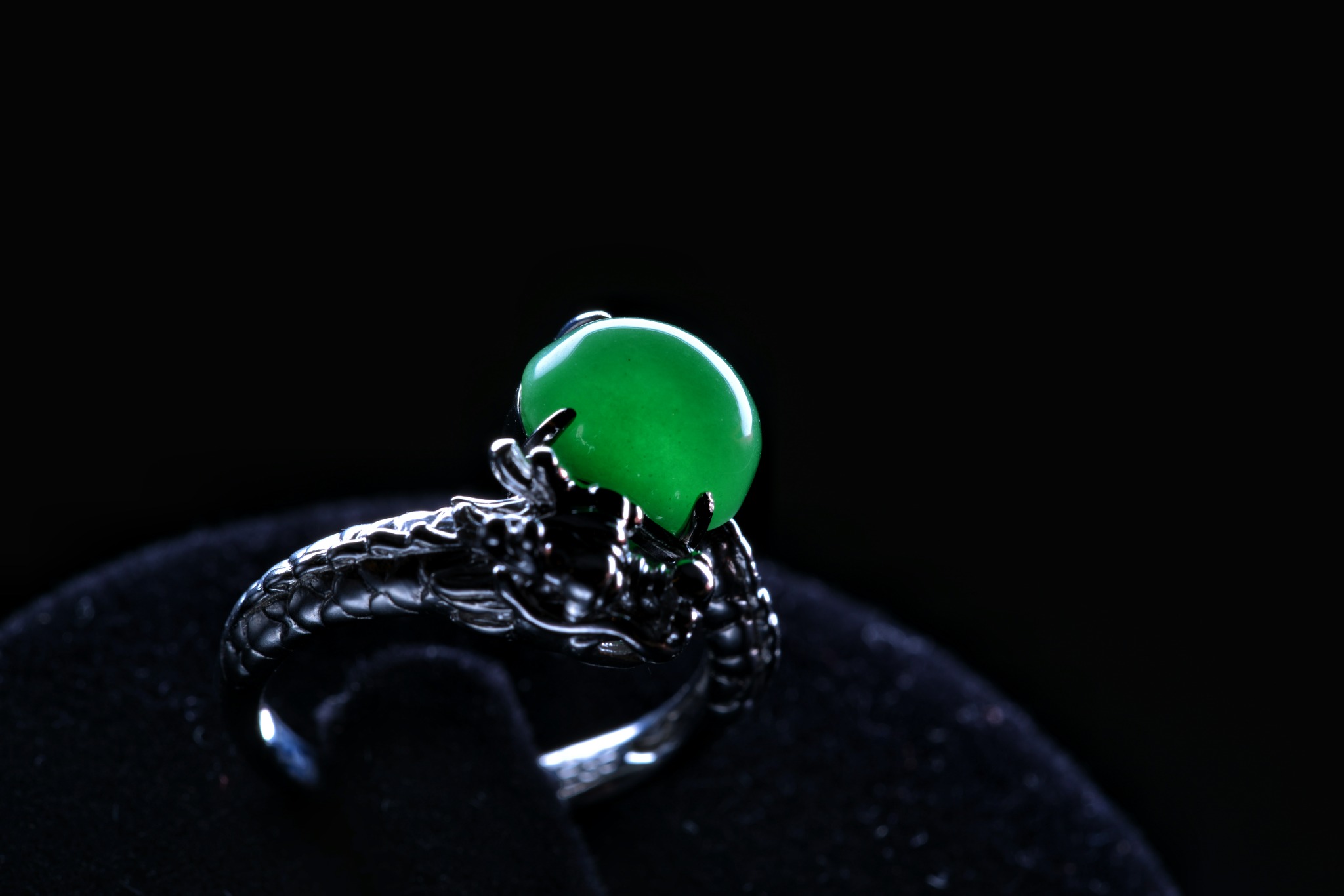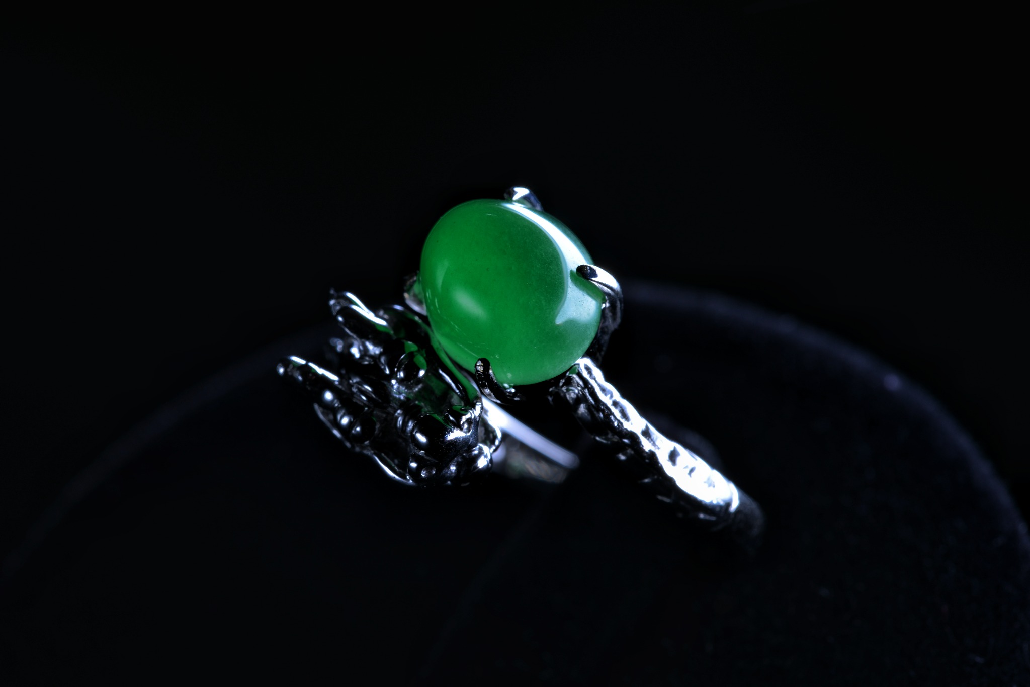 This dramatic ring features a smooth, round cabochon of intensely green jadeite held firmly in a claw setting. The stone is the focal point of a unique and powerful design