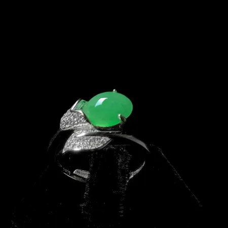 This delicate ring features a central, smooth cabochon of luminous green jadeite. The stone is elegantly cradled by a stylized floral or leaf motif setting.The surrounding design consists of graceful, sweeping elements that resemble two sparkling leaves, one on each side.This design beautifully contrasts the jadeite's smooth, vibrant form with the glittering, textured leaves, creating a feminine and nature-inspired statement piece.