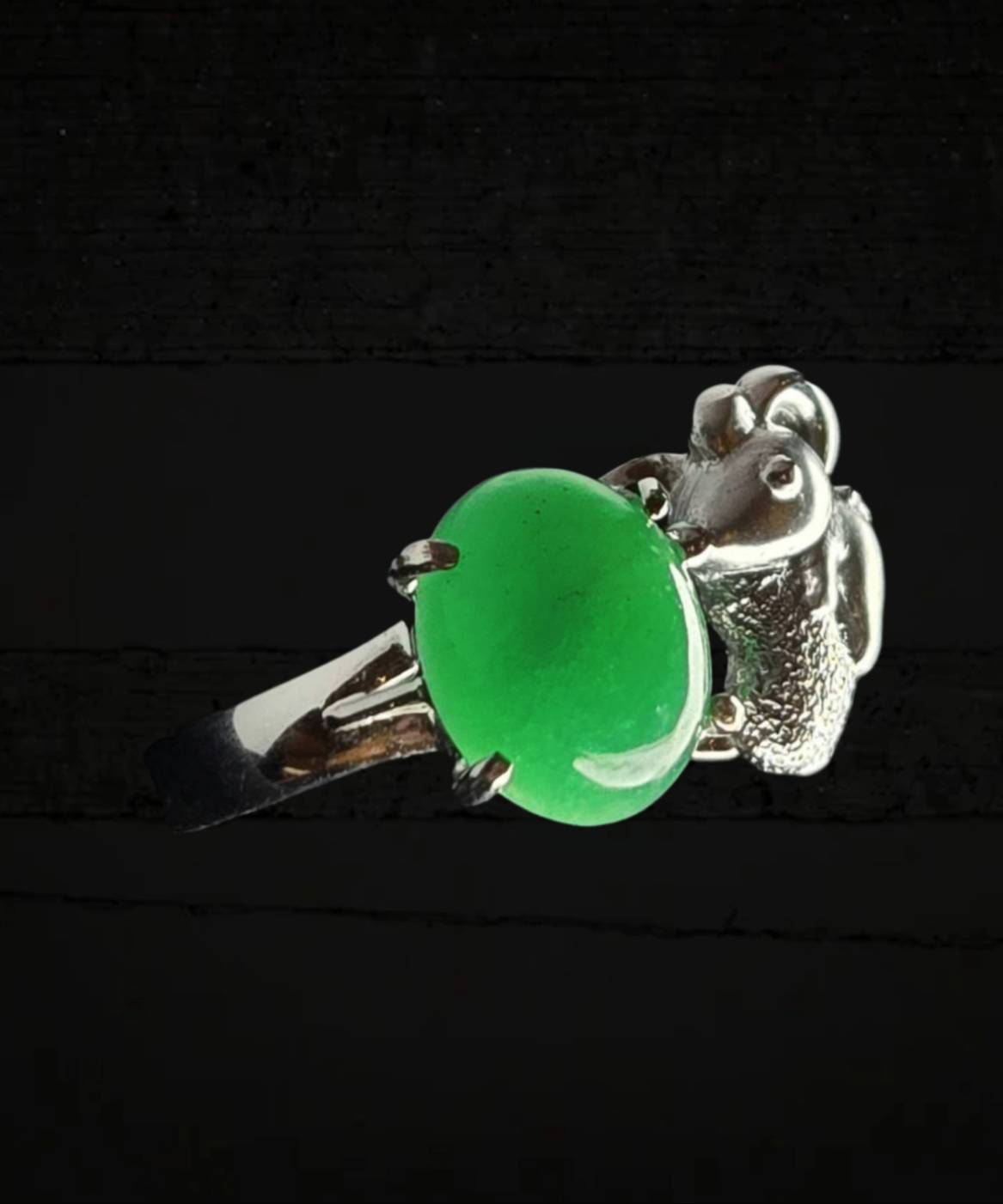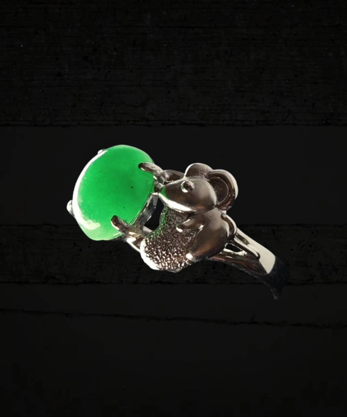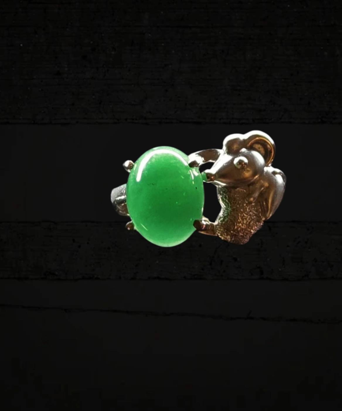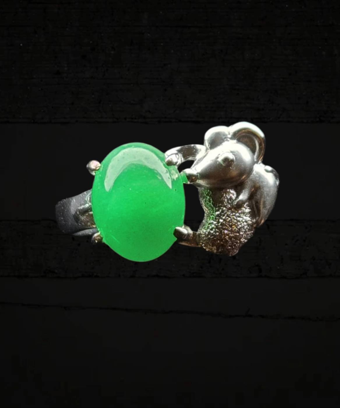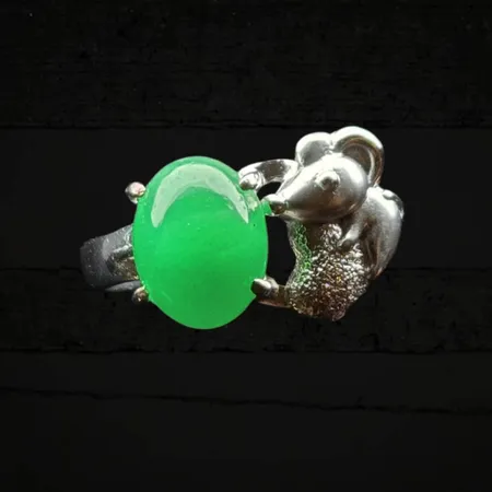 The main stone is set in a polished metal band, which is distinguished by its unique side detailing. The centerpiece is boldly accentuated by a sculptural mouse motif perched beside the jadeite. This figure is textured and perhaps micro-paved with small stones, creating a fascinating contrast between the smooth, organic glow of the jadeite and the intricate, glittering metalwork.
