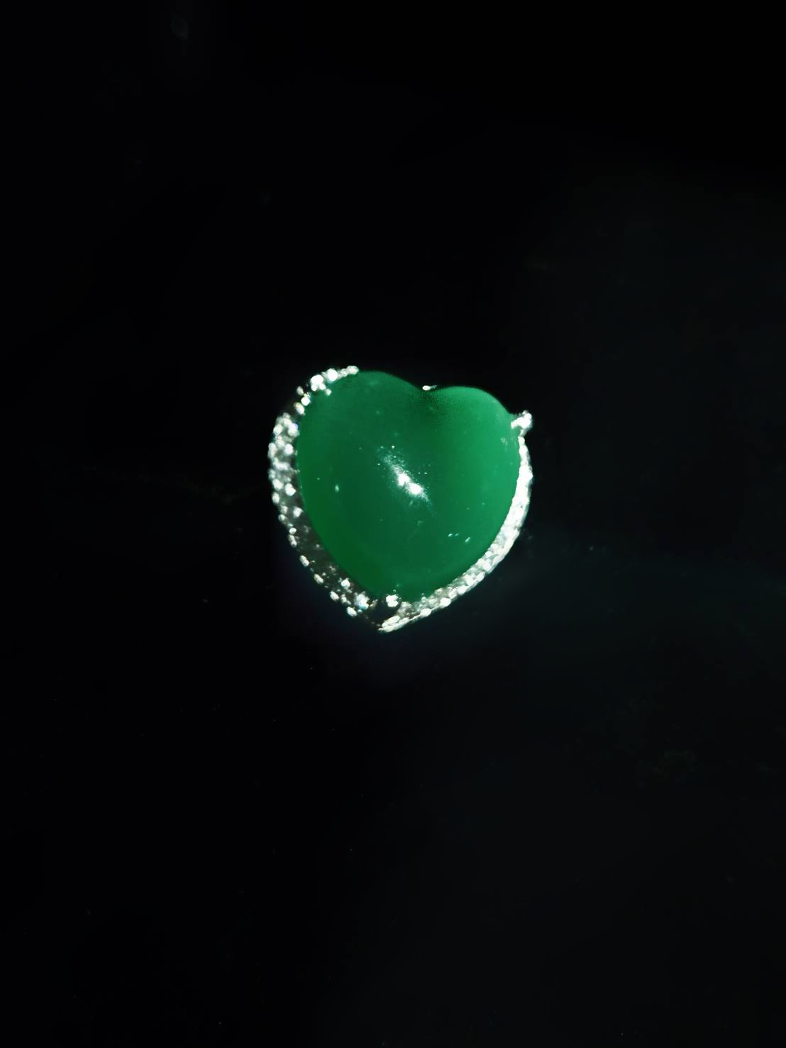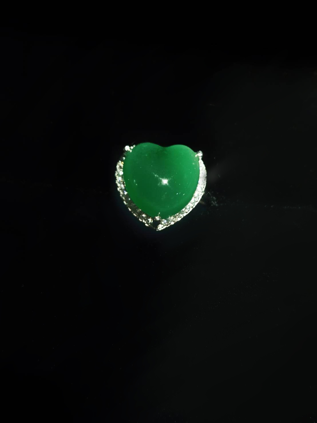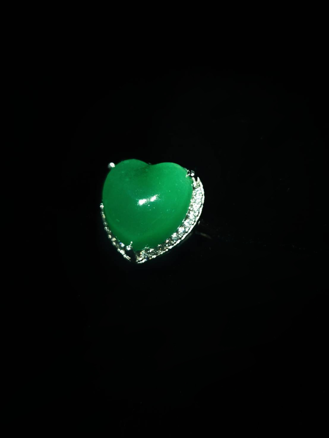This romantic ring features a large, high-domed cabochon of intensely green jadeite precisely cut into the shape of a smooth, plump heart. The jadeite's glossy polish enhances its rich color.