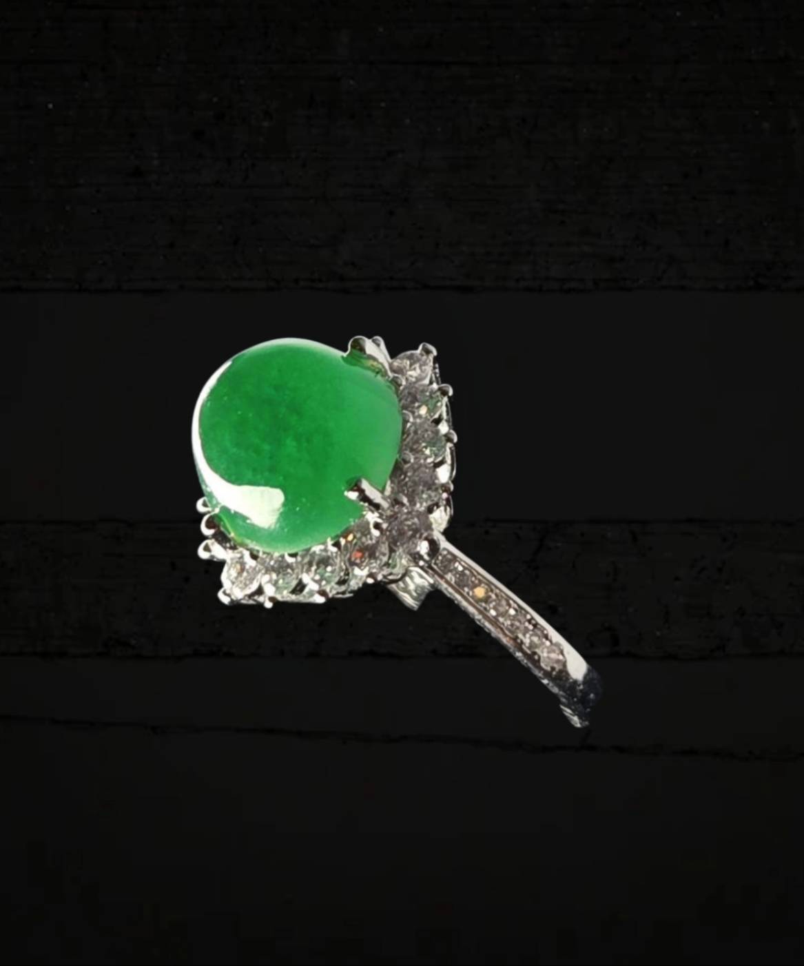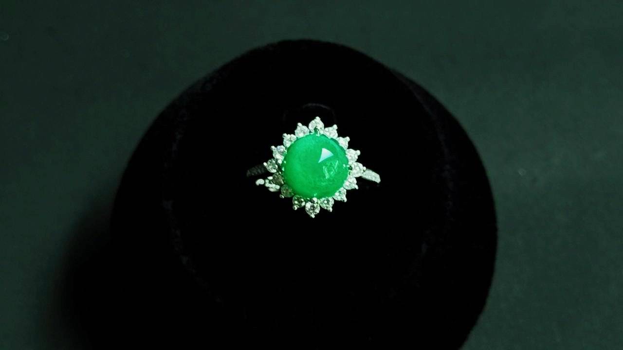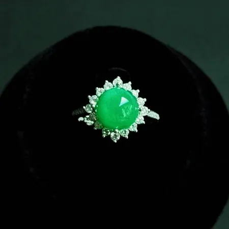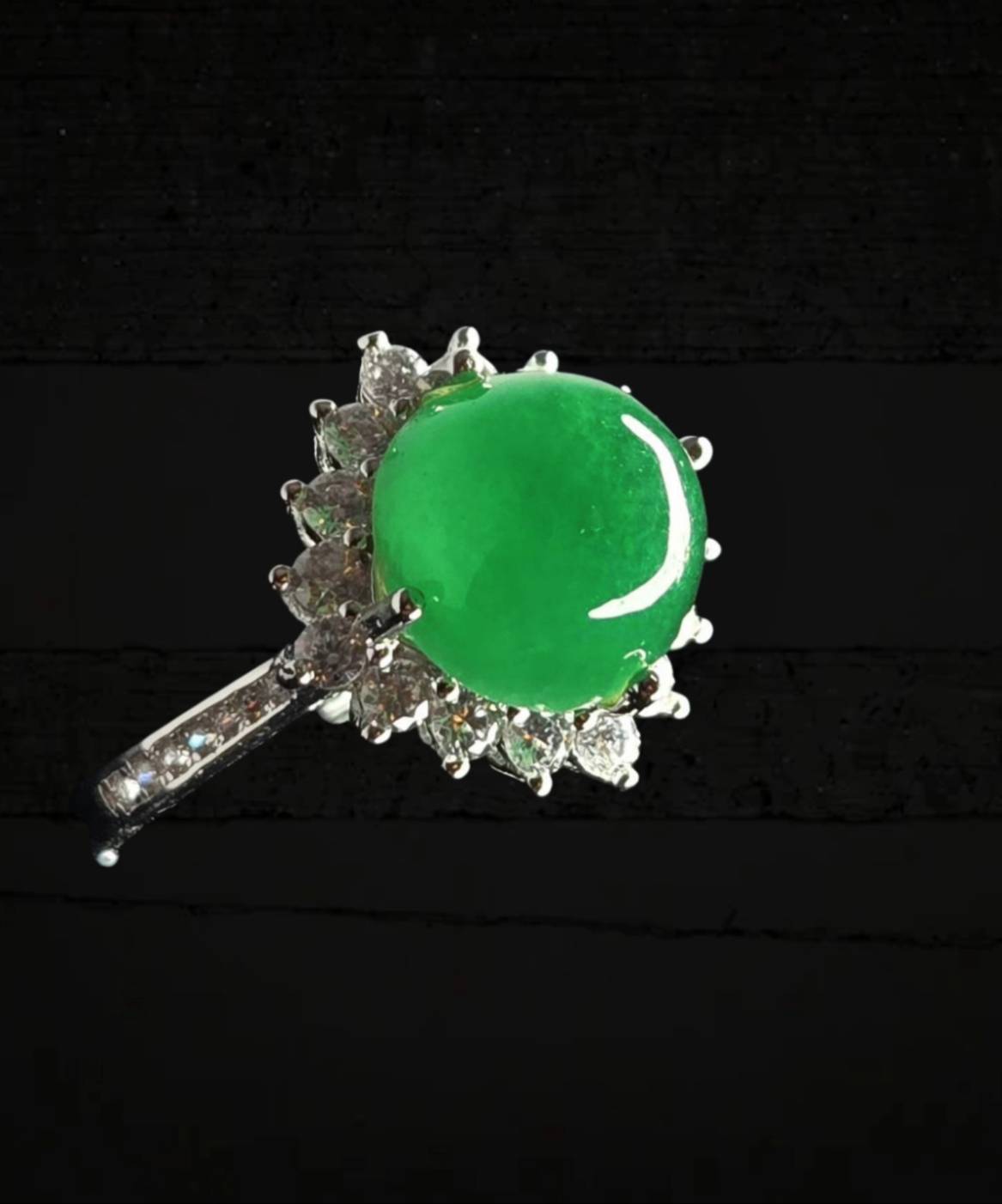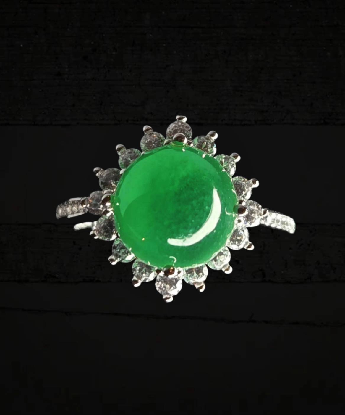 This exquisite ring features a central, round cabochon of intensely bright green jadeite with a high, glossy dome. The jadeite is the centerpiece of a magnificent cluster design, where a surrounding border of sparkling accent stones is arranged in a dramatic sunburst or floral pattern. These glittering points radiate outwards, creating a bold, glamorous halo that beautifully frames and contrasts the smooth, luminous green of the main stone.