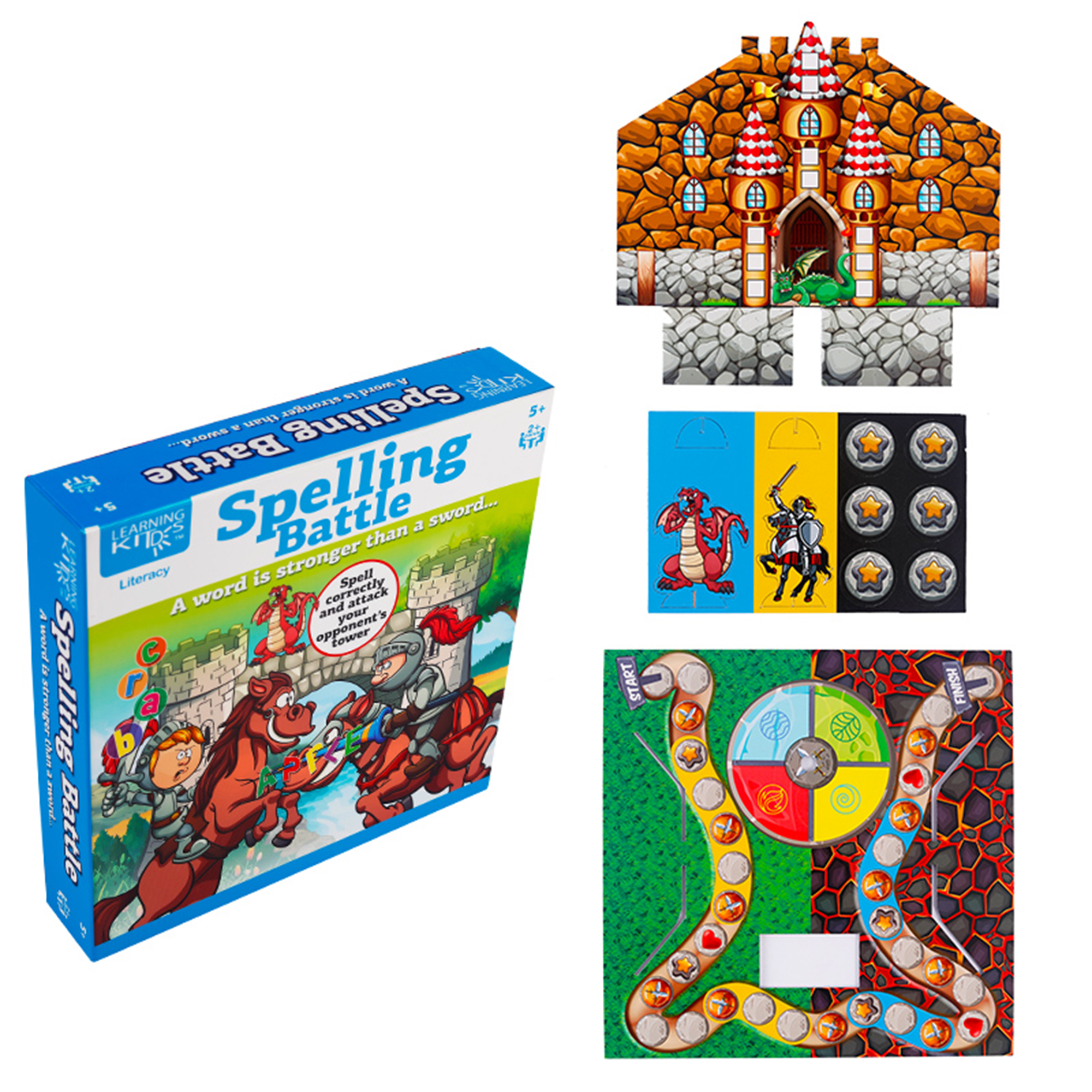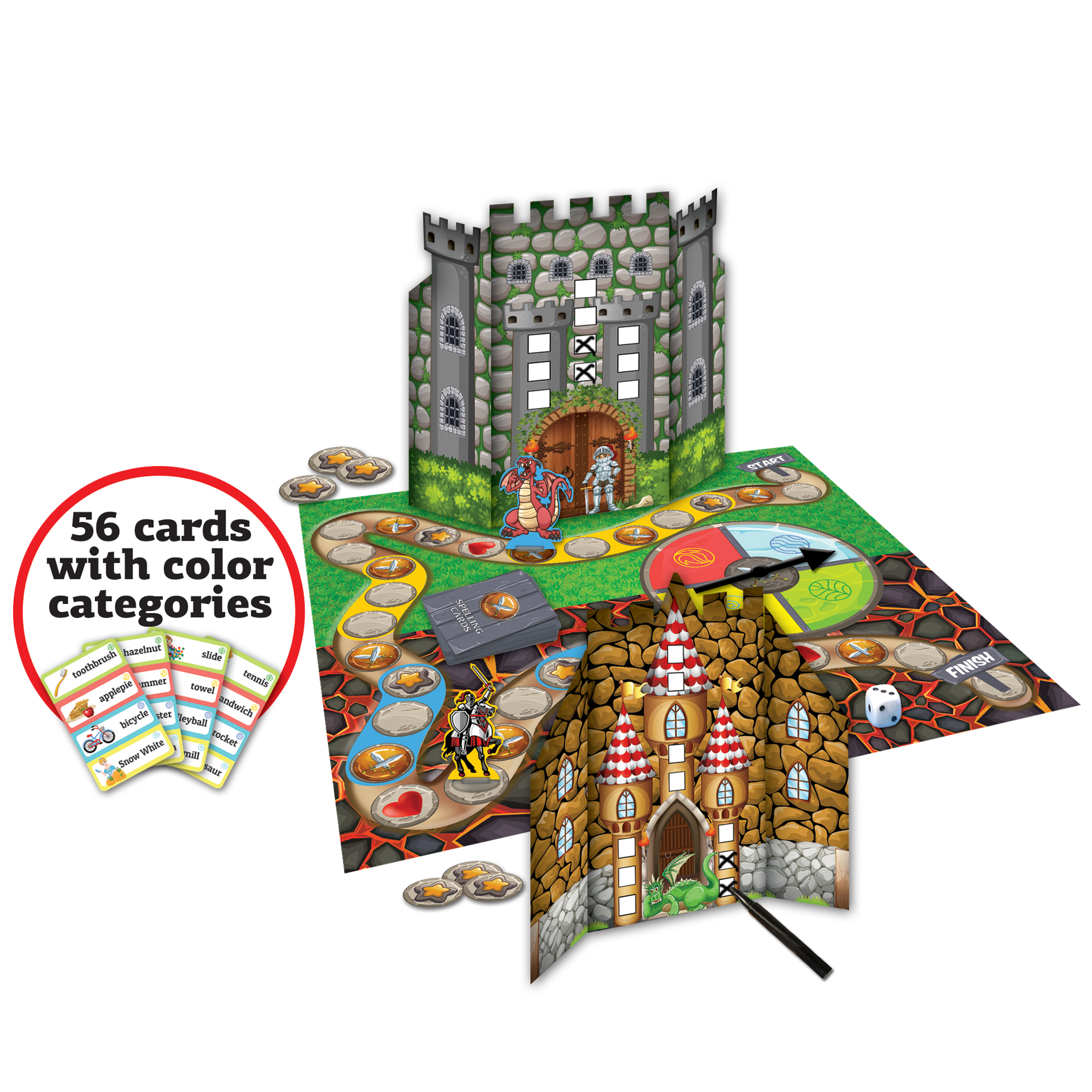 • This game stimulates language and spelling skills in a competitive environment. Spell the words correctly to win. Include 56 cards with color categories and 2 castles. Age 5+