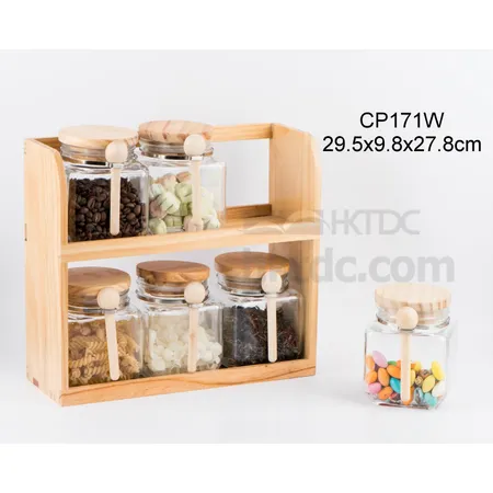 Square glass food jar candy jar with wooden lid and spoon and wooden rack