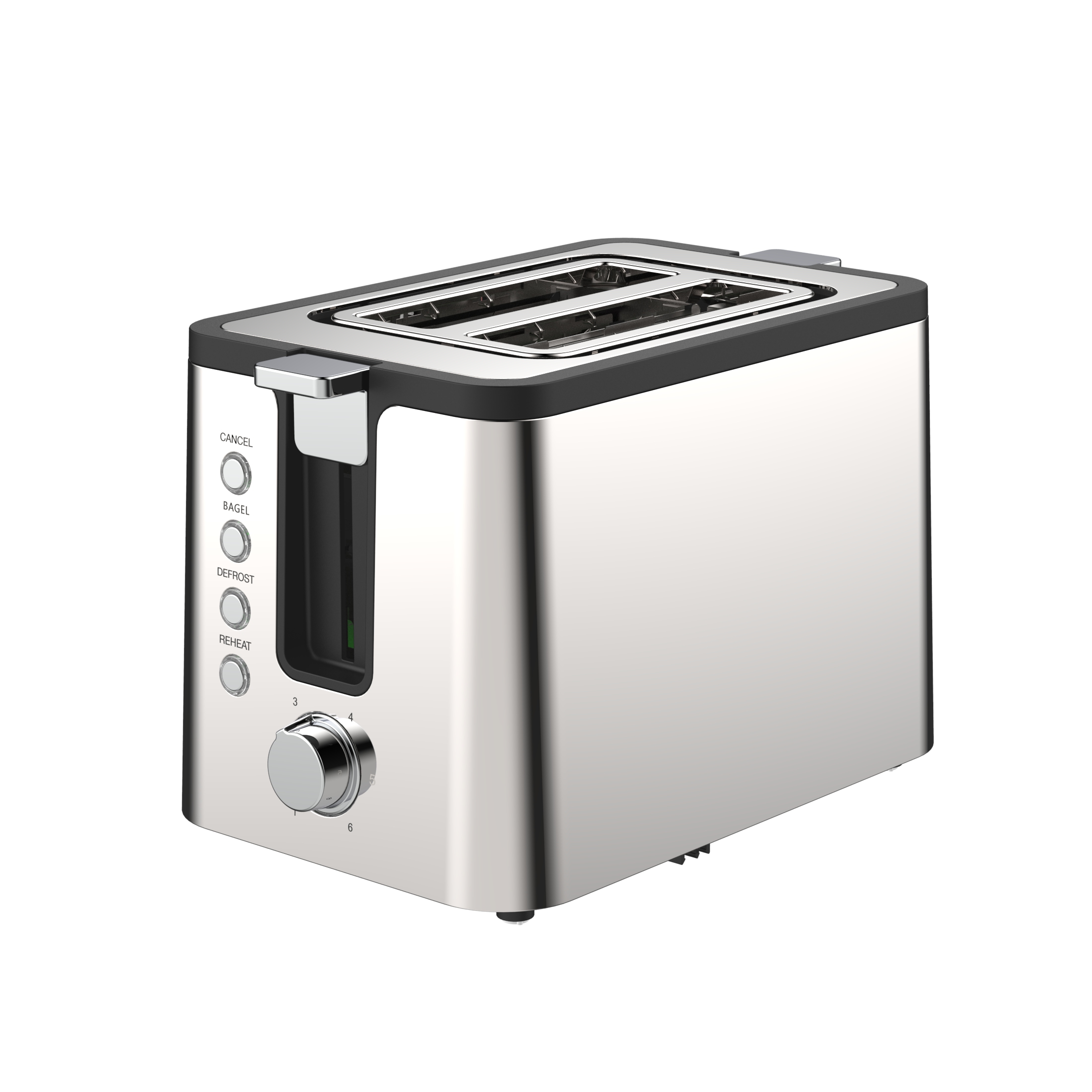 2-slot toaster Brushed Stainless housing Injection colored plastic frame and bottom Blue LED illuminated switches for Defrost, Reheat, Cancel function Chrome plated knob and levers Stepless browning control for Lever 1-6 Self-centering guides Automatic ejection of toast after each toasting Integrated bun warmer with lever Slide out crumb tray Cord storage underneath Non-slip feet 220-240V ~ 50/60Hz 800W GS/CE approval