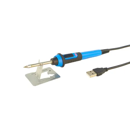 - Compact yet powerful USB soldering iron 10W - Quick heat up - Max tip temperature 480ºC - Solders up to 18AWG and even thicker - Iron-plated long life tip - On/Off switch on handle - Cool touch and light weight handle with heat resistant plastic CE/LVD/EMC/CB/ROHS/REACH *needs 5V power source to work (e.g. power bank / computer / 5V power source)