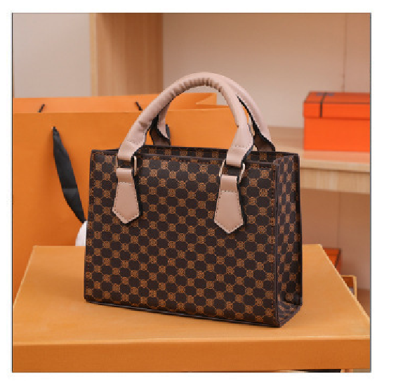 💎 Iconic Pattern: The primary design feature is a distinctive geometric monogram-style print in rich dark brown and black, giving the bag an instantly recognizable, luxurious feel.