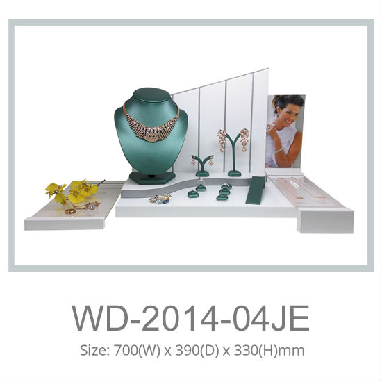 Size: ~ 700 x 390 x 330 mm Platform only. Made of light wood or MDF and white painting, on the edge of platform wrapped with silver pattern paper. Sharp color and good design can be captured customers’eyes. Small and light set of display can be carried along to exhibition. Enable to display necklace ,pendant, earring, bangle or ring, etc. Size can be adjusted if necessary. Color and material can be tailor made.