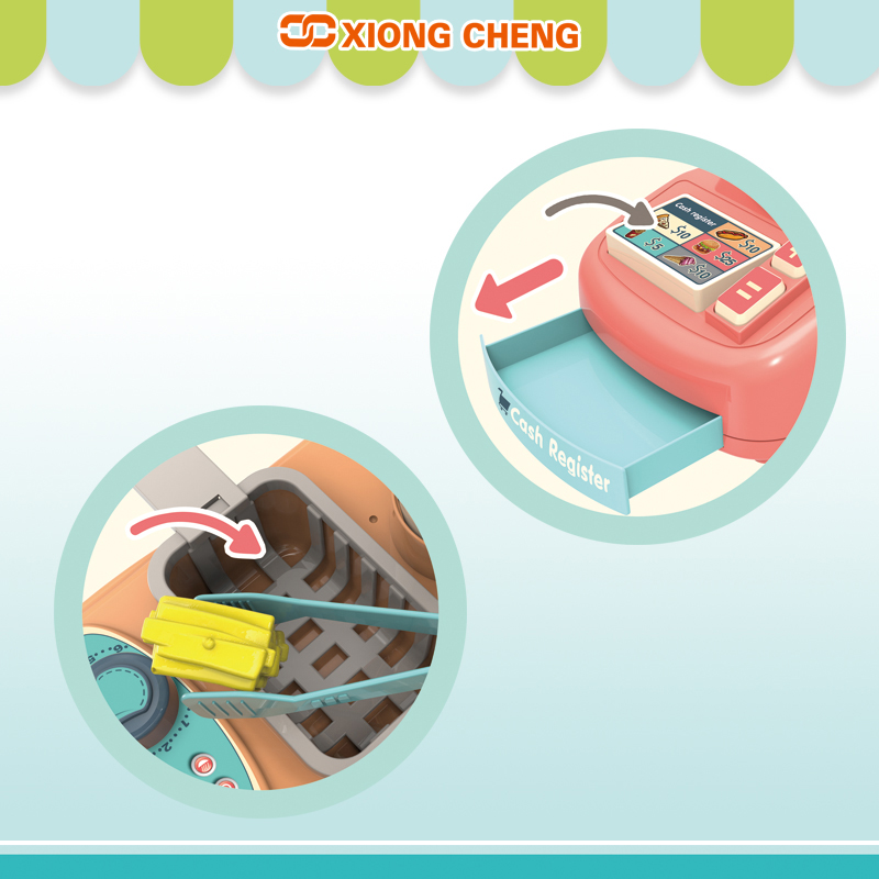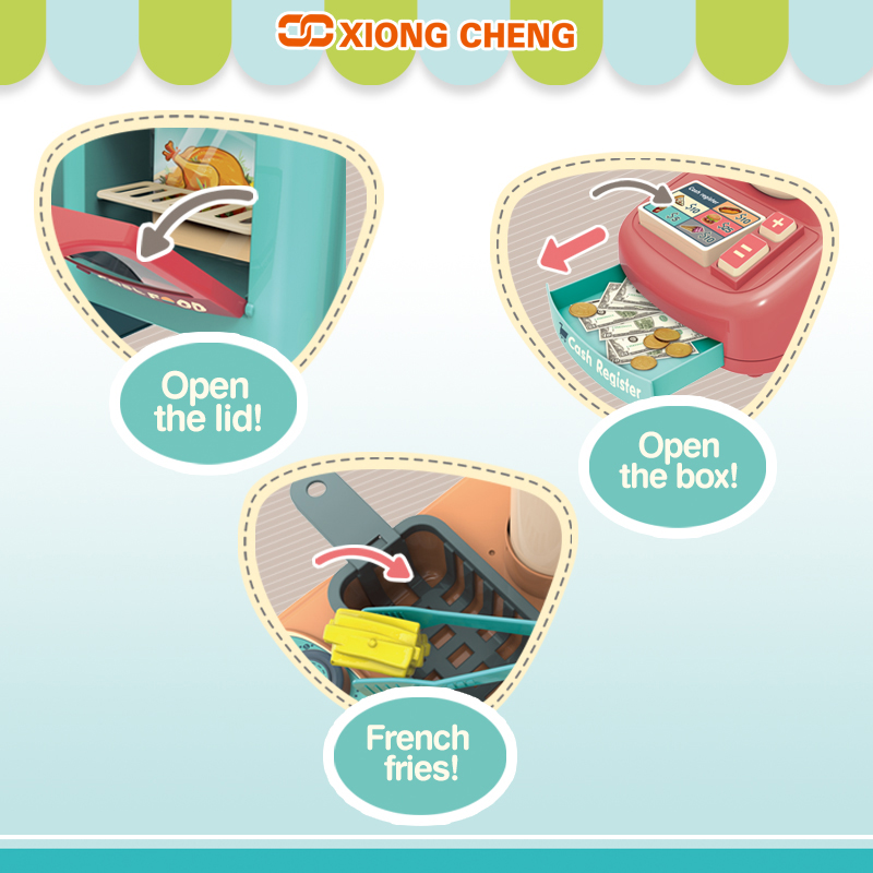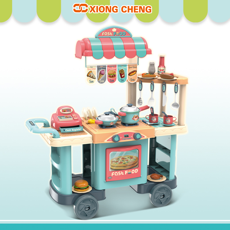 This play set is constructed from high-quality, durable materials to withstand the enthusiastic play of kids. The main structure of the kitchen is designed with attention to detail, featuring a stove with burners that can be "turned on" and "off" with a simple twist or push, accompanied by realistic clicking sounds to enhance the play experience. The oven has a door that opens and closes smoothly, allowing children to "bake" their favorite pretend treats.