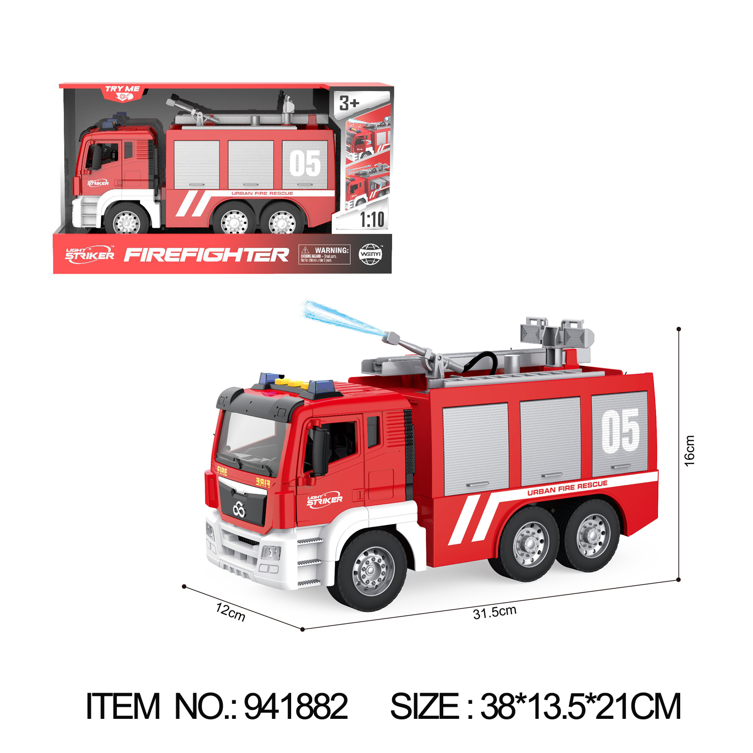 1:10 FRICTION FIRE ENGINE WITH SOUND & LIGHTS,SPAYING WATER(USE 3 PCS AG13 INCLUDED),TEST REPORTS:EN71 PART1-2-3/PHTHALATE TEST / ROHS/EMC.