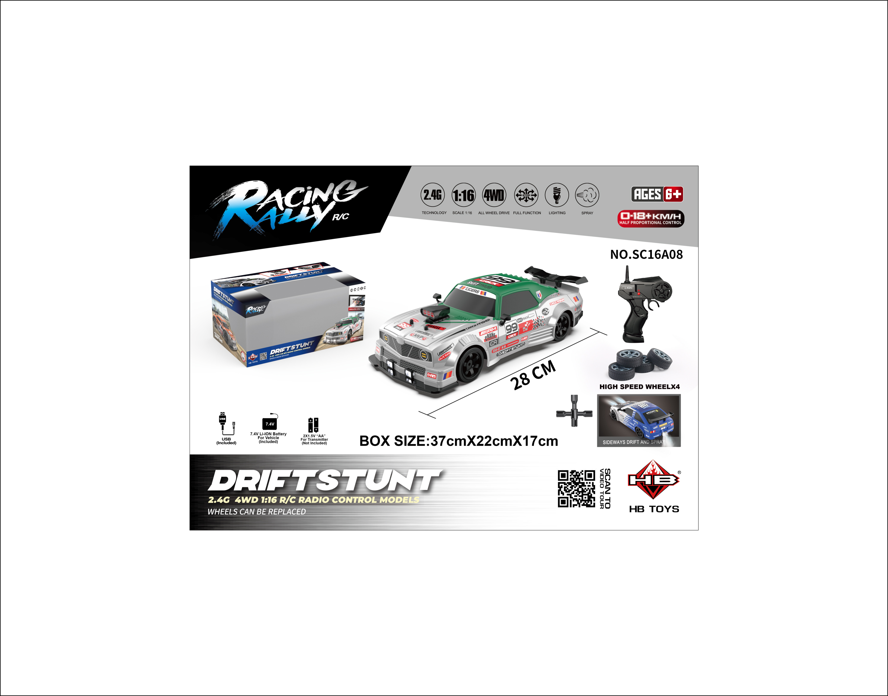 •2.4GHz •LED LIGHT •Spray funtion •Cotrol distance 35M;speed 18KM/H •4-Wheel Drive •Drifting •Additional Set of TPR Wheeles •Forward/Backward,Turn Left/Right,Roll